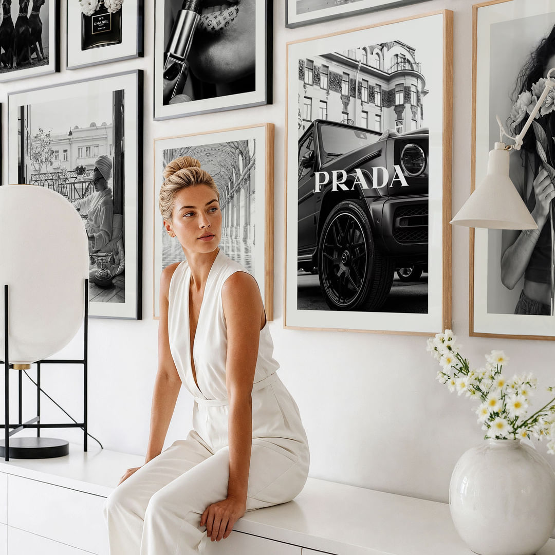 Dette svart-hvite fototapetet forener Prada, Coco Chanel og Louis Vuitton i en harmonisk komposisjon, hvor hver plakat bidrar til en moderne og sofistikert atmosfære. Kontrastene mellom arkitektoniske detaljer og subtil minimalisme skaper en følelse av tidløs eleganse. Disse plakatene forvandler rommet til et sted med stil og balanse, hvor hvert motiv fremhever det unike ved det enkle og det komplekse.