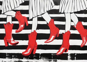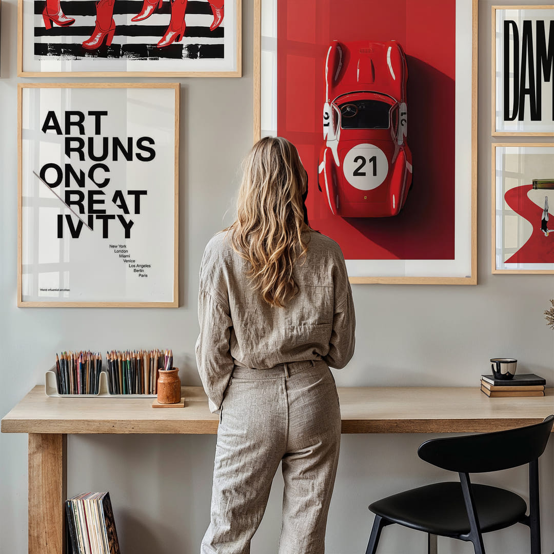 Denne veggkunsten utstråler kraft og bevegelse gjennom kontrasterende røde farger og uttrykksfulle motiver. Disse plakatene utfyller hverandre med en dynamisk balanse mellom tekst og bilde, og skaper en moderne og inspirerende atmosfære. Den røde Ferrarien kombinert med trykte budskap skaper en visuell rytme som løfter rommet og fremkaller en følelse av kreativ frihet og fart.