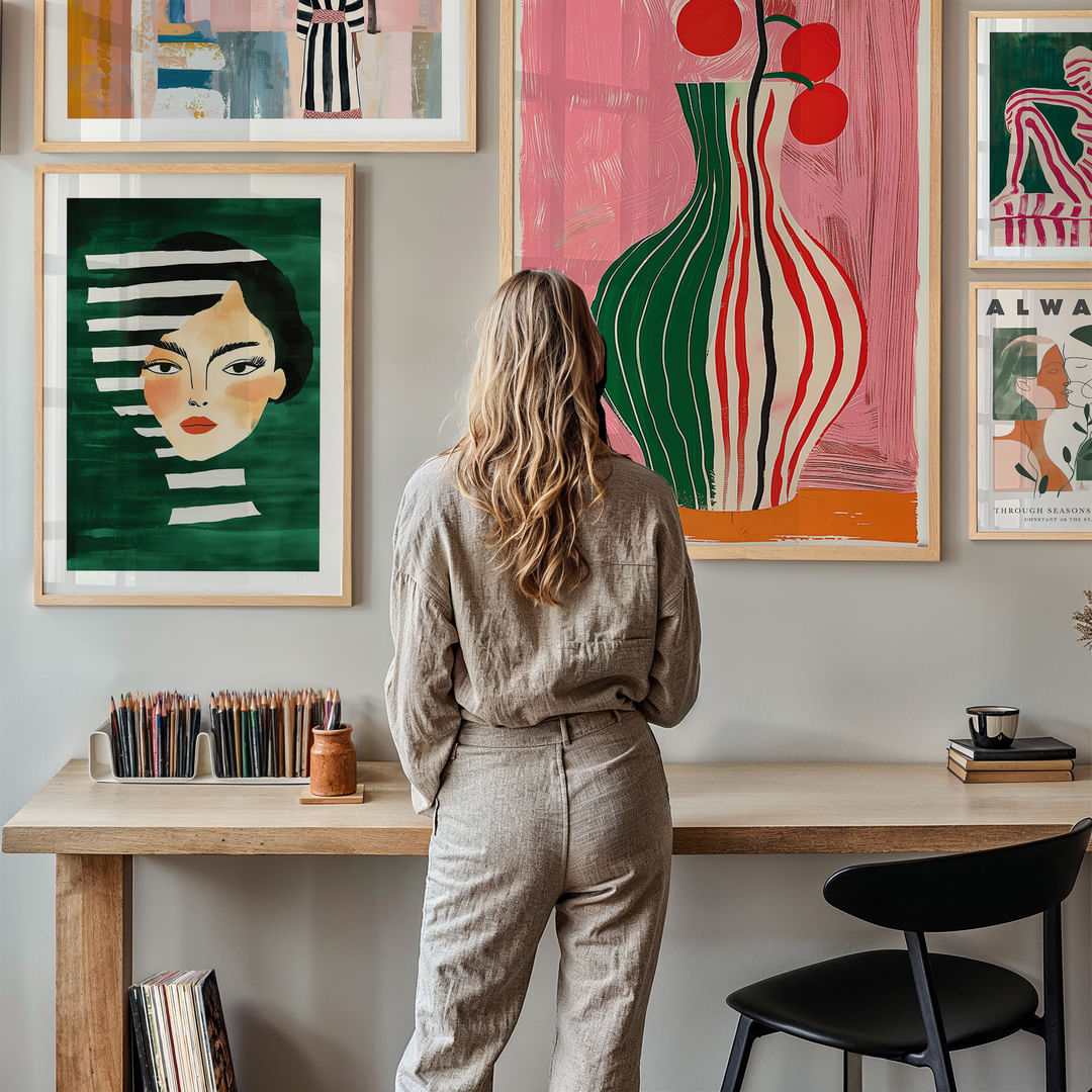 Denne kunstveggen byr på en levende blanding av farger og former som umiddelbart fanger blikket. De dristige, geometriske mønstrene kombinert med retro-inspirerte elementer skaper en dynamikk som forsterkes av rike fargetoner og leken asymmetri. Hver plakat bidrar med en unik energi, noe som resulterer i en sammenhengende og inspirerende kunstnerisk opplevelse som forvandler ethvert rom til en sofistikert oase.