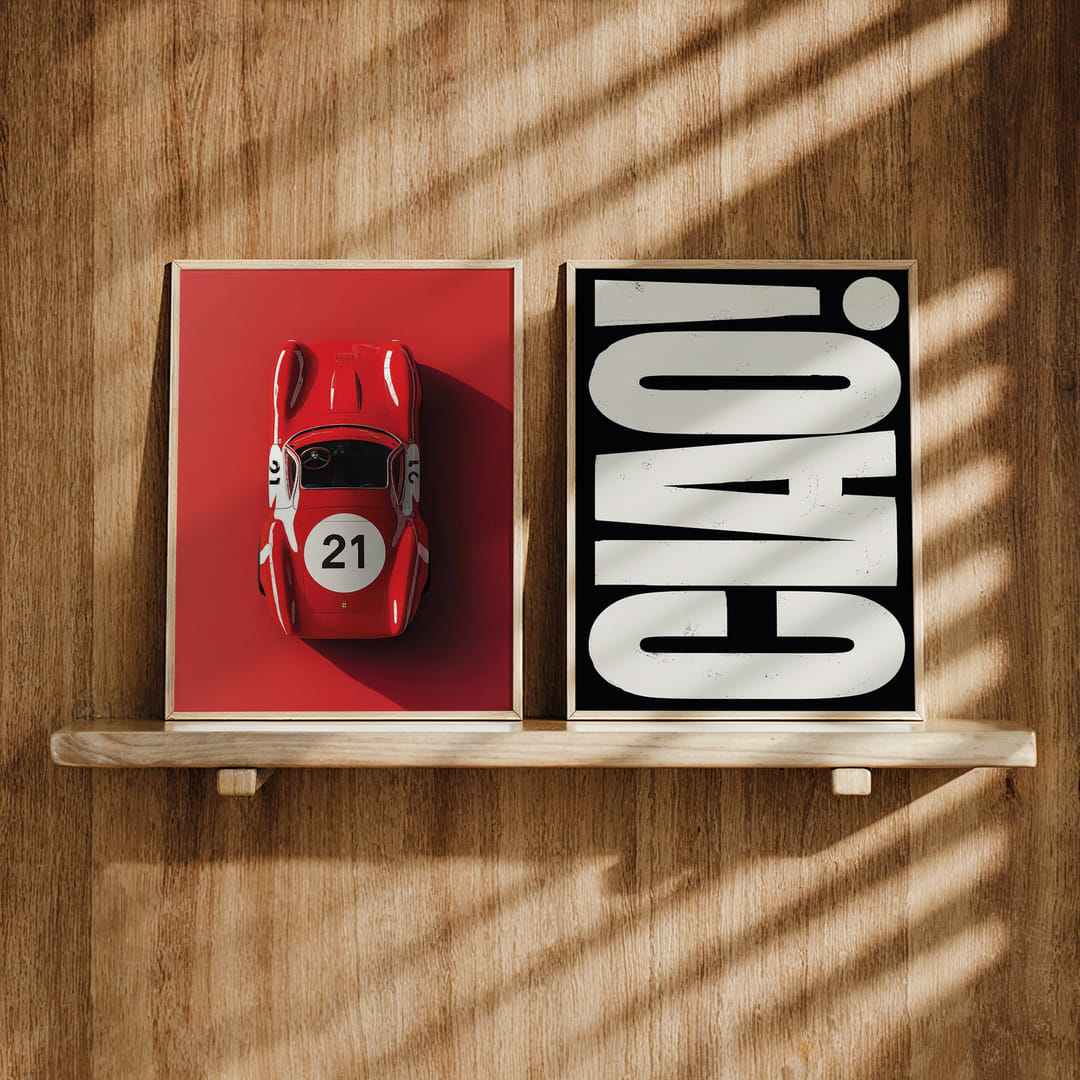 Denne veggkunsten fanger oppmerksomheten med sin kraftfulle kombinasjon av en intens rød Ferrari Le Mans og monokrom svart-hvitt-tekst, og skaper en fengslende ballett mellom bevegelse og stillhet. Disse plakatene forener temaene fart og stil og skaper en kraftig visuell effekt. Dens tilstedeværelse løfter ethvert rom til en moderne og stilig oase med sitt elegante og selvsikre design.