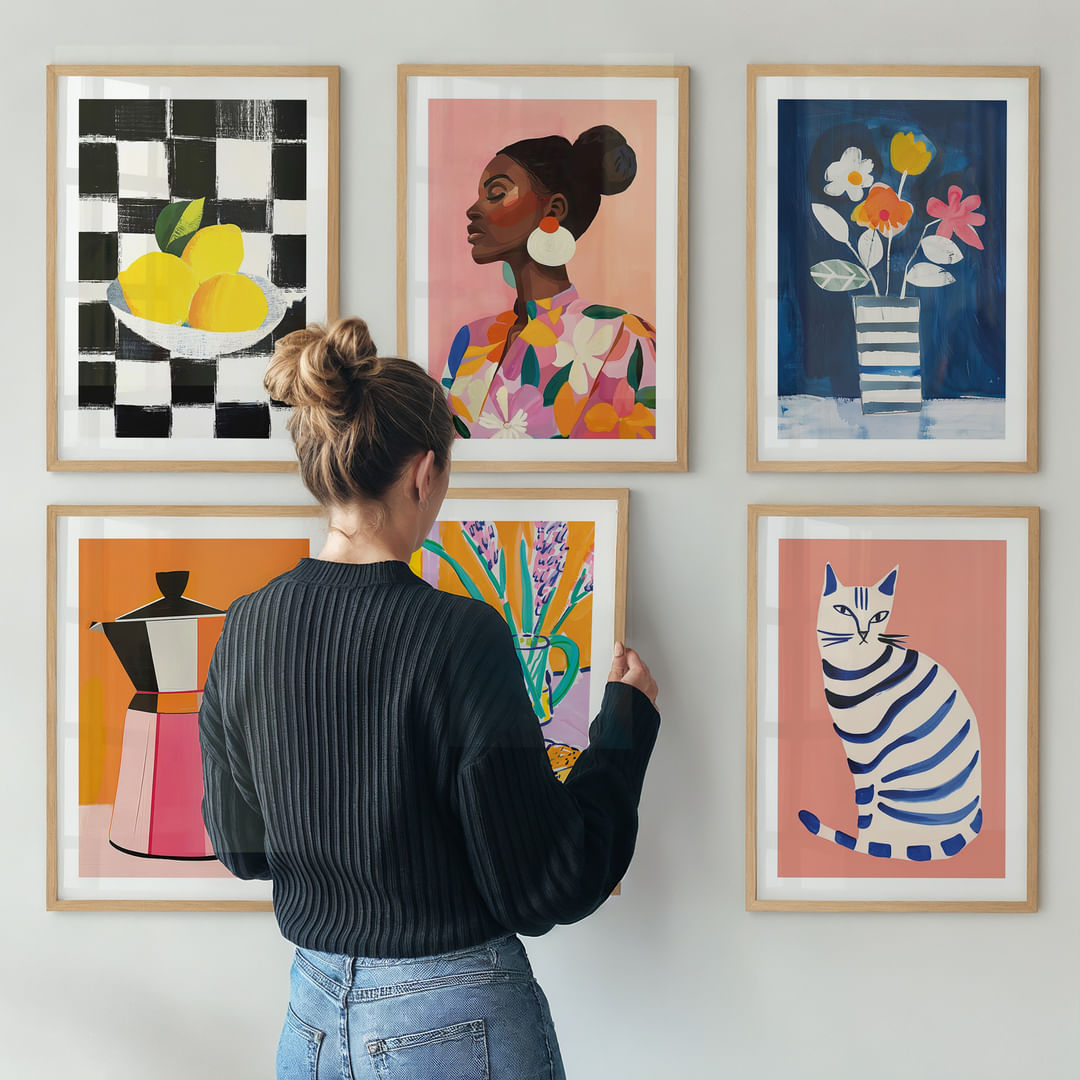 Denne kunstveggen kombinerer en dynamisk blanding av fargerike plakater som sammen skaper en harmonisk og gledelig atmosfære. Med fokus på sitrus, et frokostbord og en tekanne i livlige farger, fanger disse plakatene både øyet og fantasien. Kunstveggen er perfekt for å tilføre en blanding av kunstnerisk sjarm og personlighet til hjemmet ditt, og vil lyse opp ethvert rom med sin inspirerende tilstedeværelse.