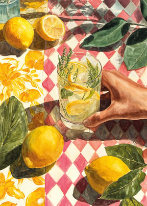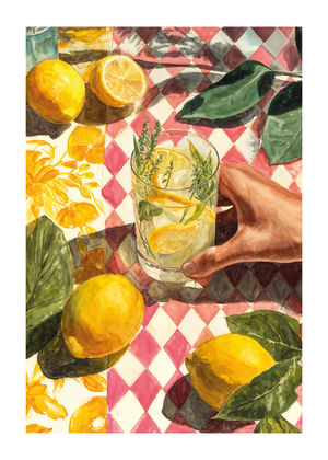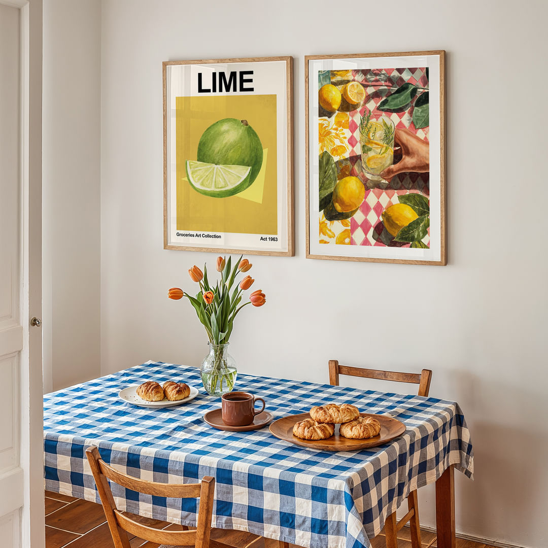 En livlig veggkunst med sitrusmotiv, hvor fargene spiller en symfoni av friskhet og livsglede. Den ene plakaten fokuserer på en stilig lime mot en moderne bakgrunn, mens den andre viser en hånd som holder en drink med sitron, omgitt av innbydende mønstre og varme fargetoner. Sammen skaper de et inntrykk av energi og optimisme, perfekt for å løfte stemningen i ethvert rom.