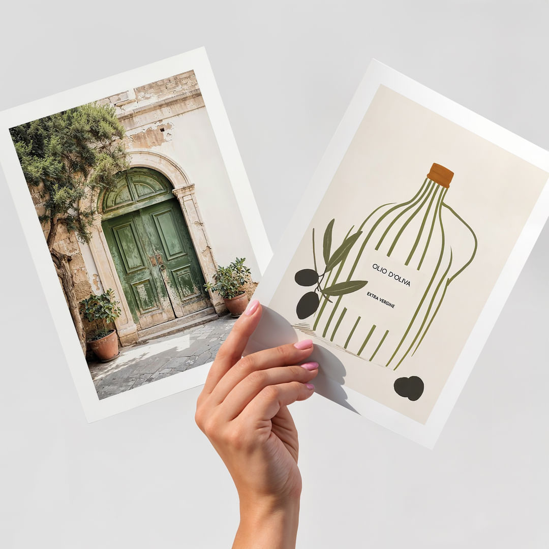 Bildeveggen utstråler en sjarmerende kombinasjon av historisk eleganse og naturlig skjønnhet. Maleriene harmonerer med en tydelig middelhavsinspirasjon der en rustikk port og et stilisert olivenmønster fremkaller en lengsel etter sørlige landskap. Fargetonene er varme og innbydende, og skaper en beroligende og innbydende følelse i rommet som fremhever dets unike karakter.