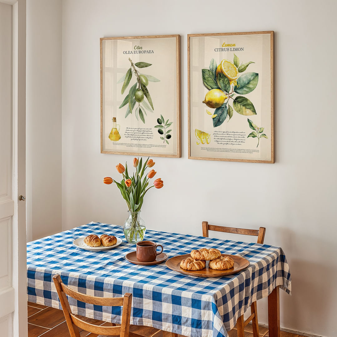 Kunstveggen byr på en innbydende symfoni der naturens skjønnhet kommer til live gjennom fargerike sitrustrær og oliventrær. De botaniske motivene samhandler harmonisk og skaper en rolig og frisk atmosfære. Disse plakatene forsterker følelsen av romlig eleganse og fremhever essensen av interiøret med sin subtile fargepalett og nøye balanserte balanse.