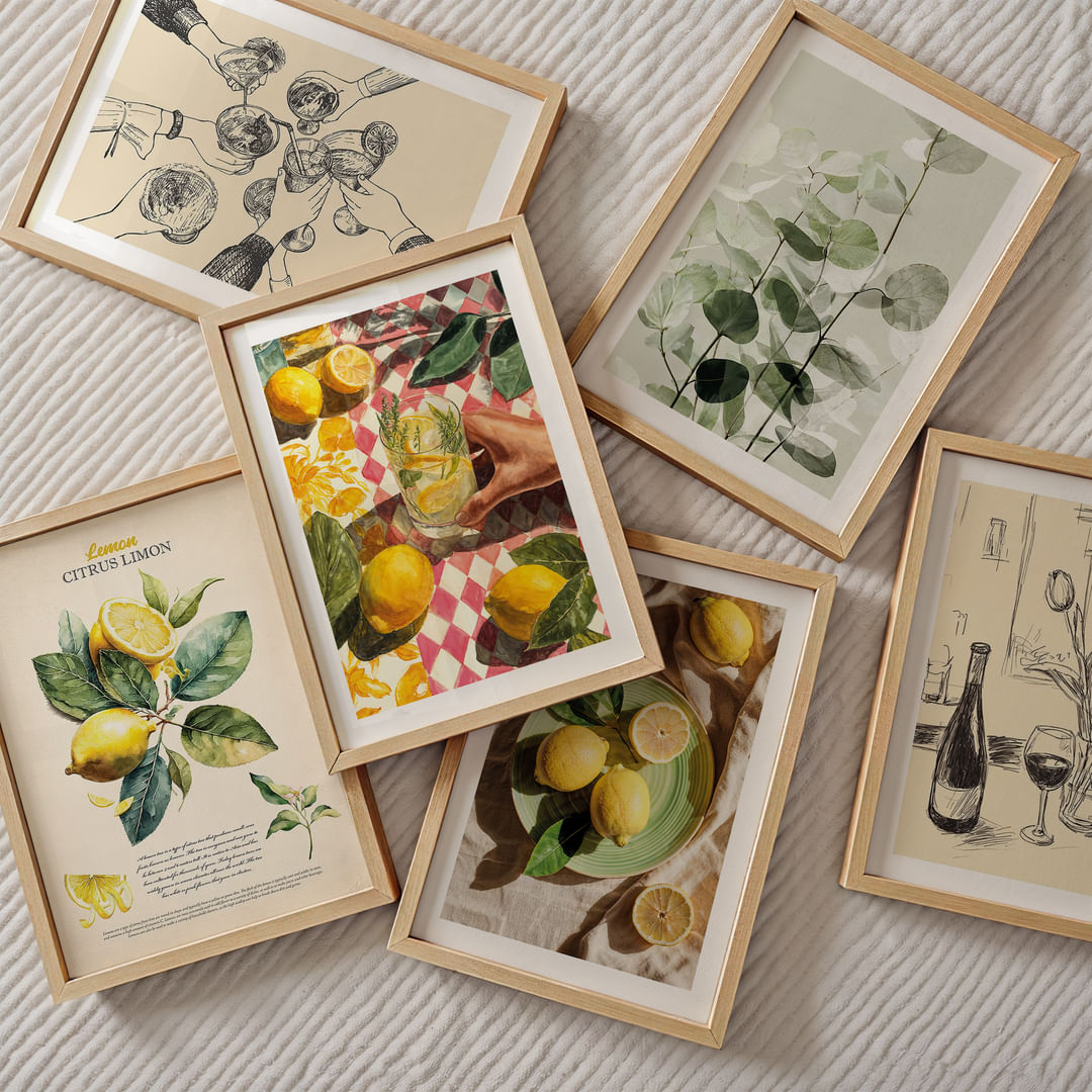 En leken kunstvegg hvor de lyse gule tonene av sitrus møter myke grønnfarger, og skaper en atmosfære av solrik friskhet og vintage-sjarm. Variasjoner i stil, fra botaniske illustrasjoner til stemningsfulle stilleben, skaper en dynamisk, men balansert følelse. Perfekt for å løfte et rom med både eleganse og livlighet, fengsler dette kunstverket med sin naturlige skjønnhet.