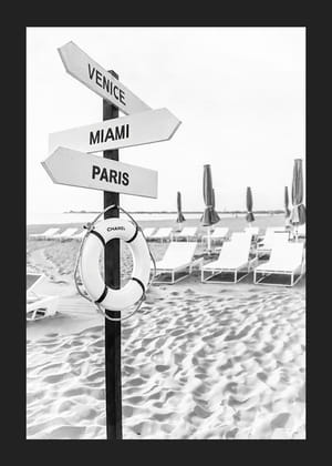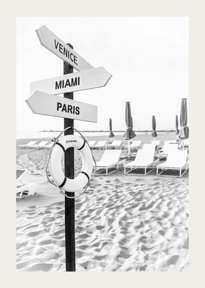 Disse Coco Chanel-plakatene i et sømløst mønster skaper en følelse av dualitet og en stilig estetikk. Ett av bildene viser en kvinne som delvis dekker ansiktet sitt med blomster og har på seg et Coco Chanel-armbånd, mens det andre illustrerer en strand med skilt som peker mot ikoniske byer. Disse plakatene formidler subtil eleganse og tilfører et snev av internasjonal sjarm og tidløshet til ethvert rom.