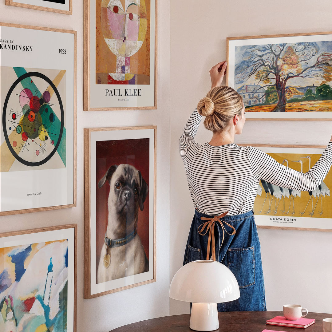 Denne veggkunsten kombinerer kunstverk av Wassily Kandinsky, Paul Klee, Edvard Munch, Ogata Korin og Carl Reichert i en livlig dialog av farger og former, der hvert verk inviterer deg til en reise gjennom kunsthistorien. Disse fargerike plakatene skaper en atmosfære full av kreativitet og tidløshet, og forvandler rommet til en inspirerende oase. Helheten forbedrer bomiljøet gjennom en harmonisk blanding av fargerike og tankevekkende elementer.