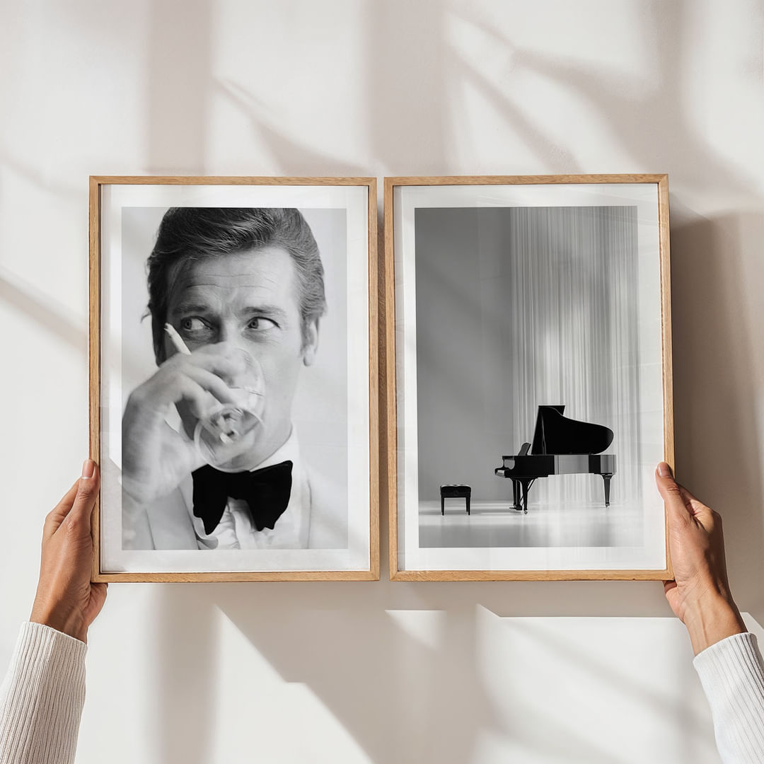 Disse plakatene fanger essensen av tidløs eleganse gjennom svart-hvitt-portretter. Med en sofistikert kombinasjon av Roger Moore i smoking og et atmosfærisk piano skaper det en følelse av klasse og stil. Det monokrome temaet skaper en nostalgisk, men likevel moderne atmosfære. Plakaten er perfekt for å tilføre et snev av klassisk sjarm til hjemmet ditt og forbedrer umiddelbart ethvert rom med sin subtile skjønnhet.