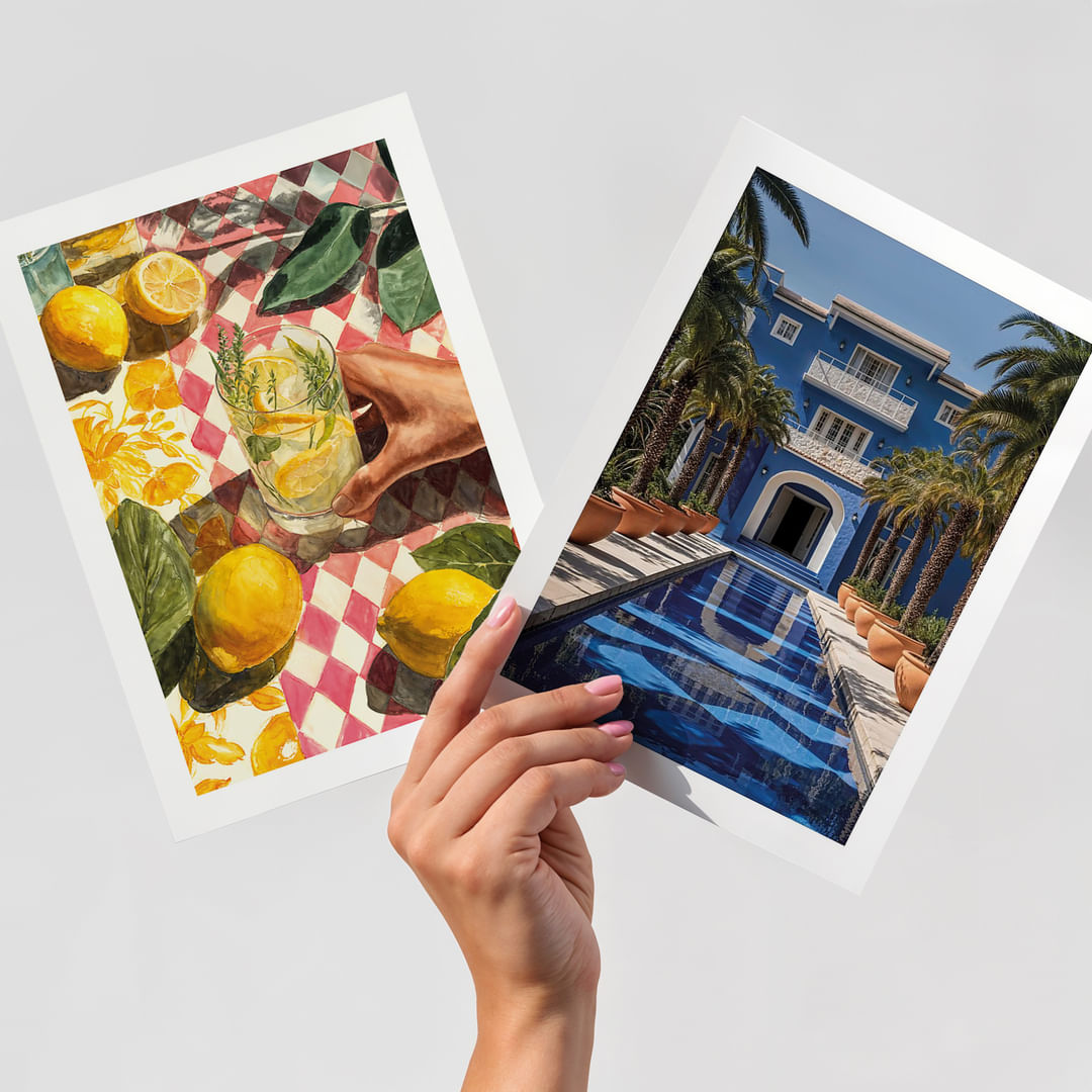 Disse livlige plakatene på denne kunstveggen danner en perfekt sommerkomposisjon med de varme gule sitronfargene i kontrast til det dypblå vannet, og fremkaller en følelse av middelhavsvarme og avslapning. Denne kunstkolleksjonen fremhever rommet som en lys og fredelig oase av ro, der hver plakat spiller en harmonisk rolle i å skape en hyggelig feriestemning.