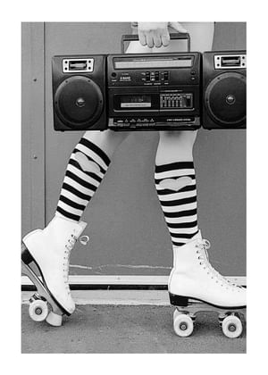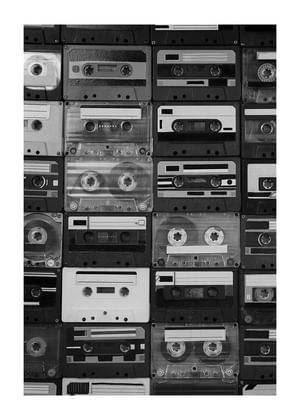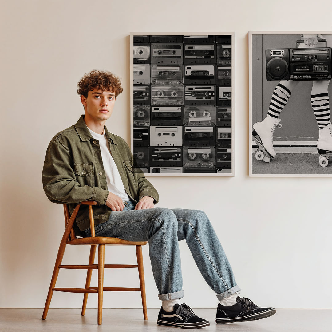 Denne kunstveggen utstråler en subtil sjarm der nostalgi og retrospektivitet møtes i en harmonisk blanding. Disse svart-hvitt-plakatene av gamle kassettspillere og rulleskøyter skaper en følelse av tidløshet og nostalgi. Denne smakfulle kombinasjonen av plakater setter tonen for rommet, fremhever personlig stil og forvandler hverdagen til en reise gjennom tiden.