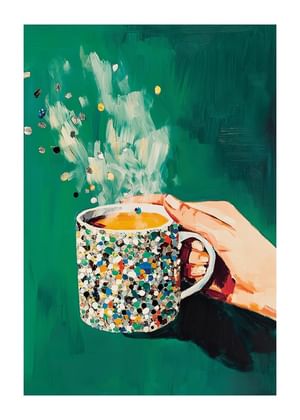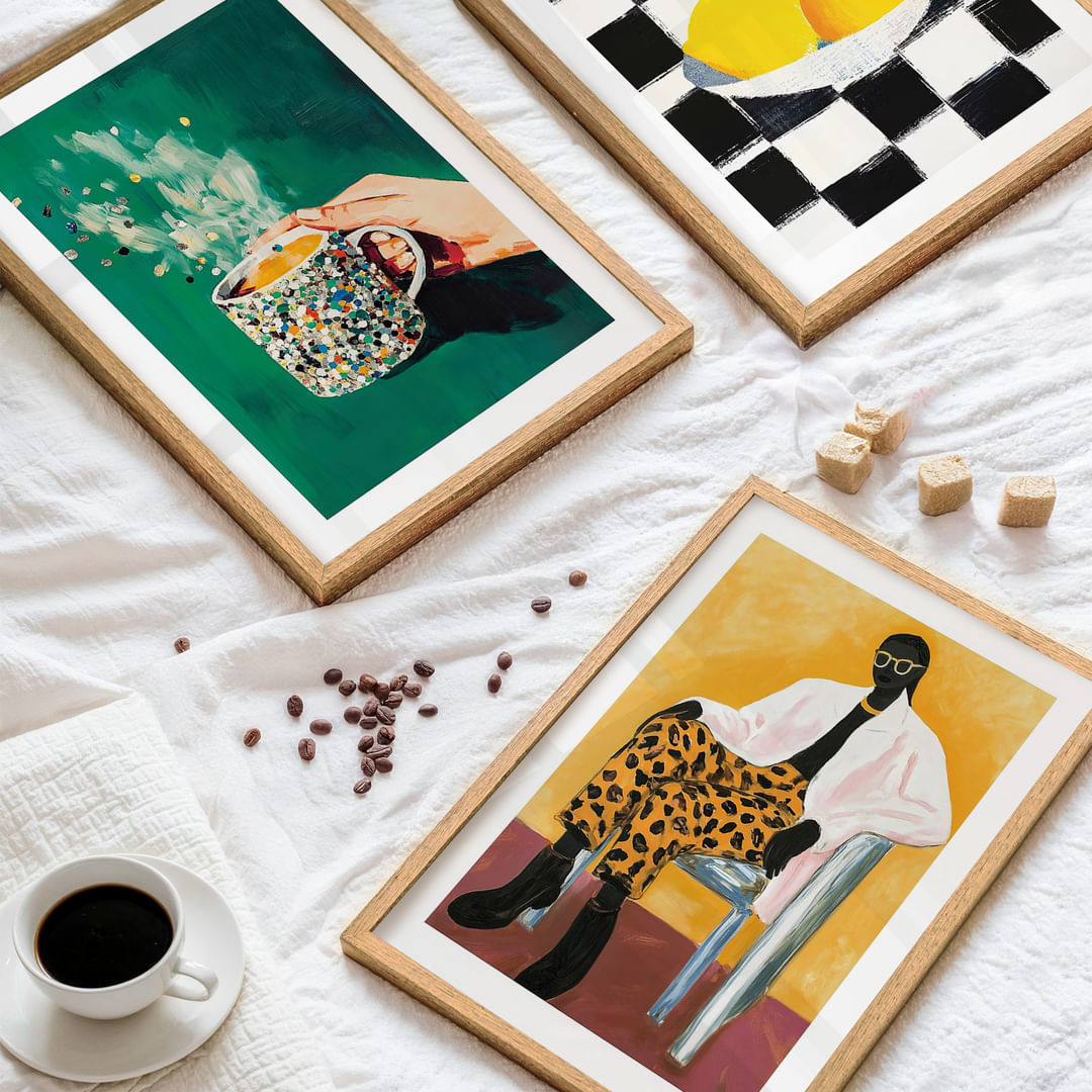 Kunstveggen fanger oppmerksomheten din med sine livlige farger og dristige uttrykk. Hver plakat spiller en unik rolle i helheten, fra den sprudlende kreative eksplosjonen av kaffe til den leopardprydede figuren. Det rutete mønsteret under sitronene skaper en rytmisk kontrast som balanseres av roligere toner. Med sin kombinasjon av energi og eleganse forvandler disse plakatene ethvert rom til et kunstnerisk rom.