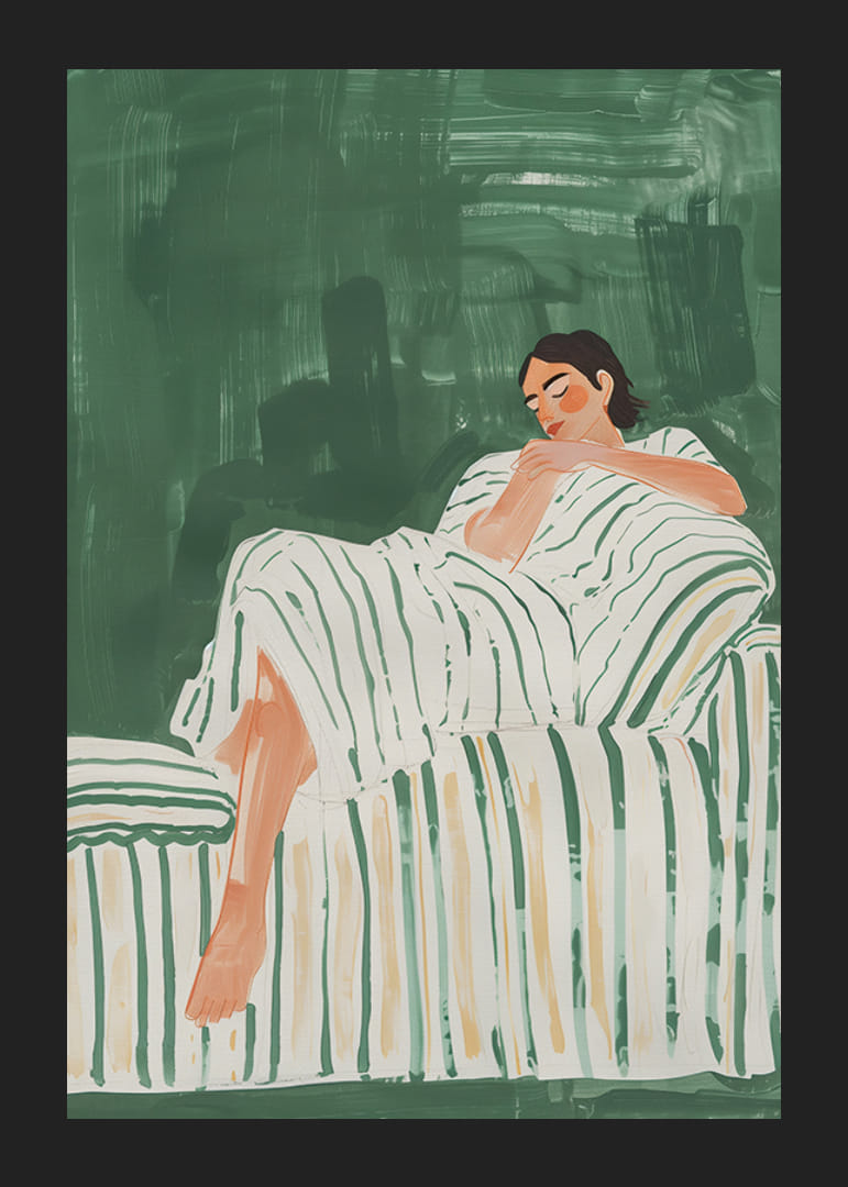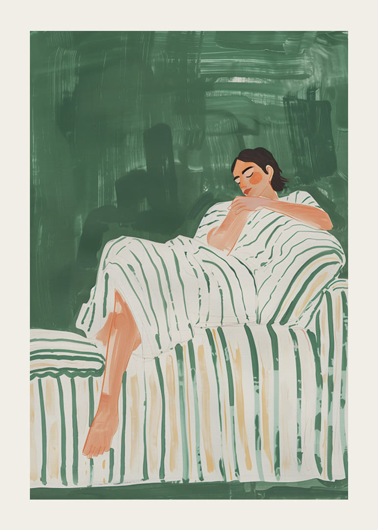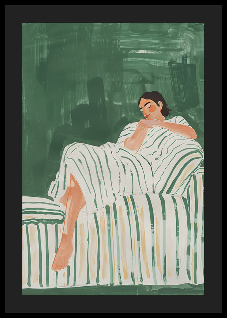 Denne plakaten fanger en følelse av fredelig hvile med en person som nyter stillheten. De grønne og hvite tonene skaper en harmonisk atmosfære hvor personens avslappede stilling forsterker følelsen av indre ro.