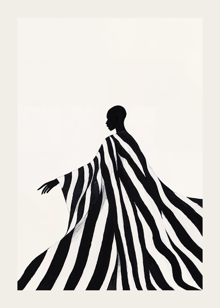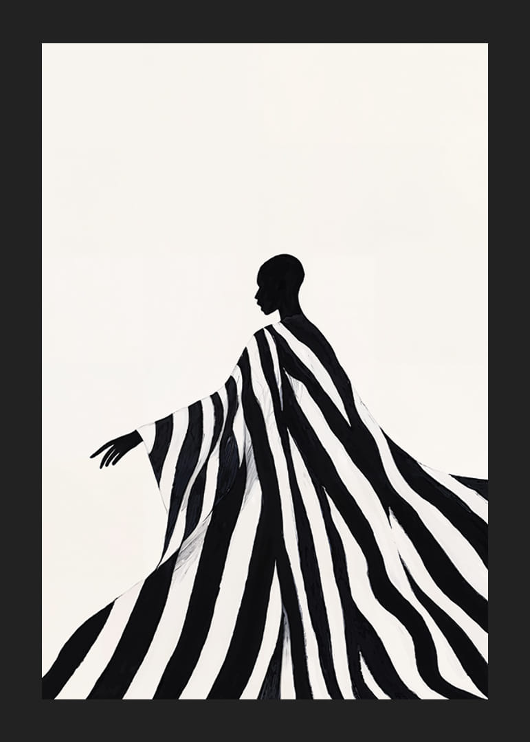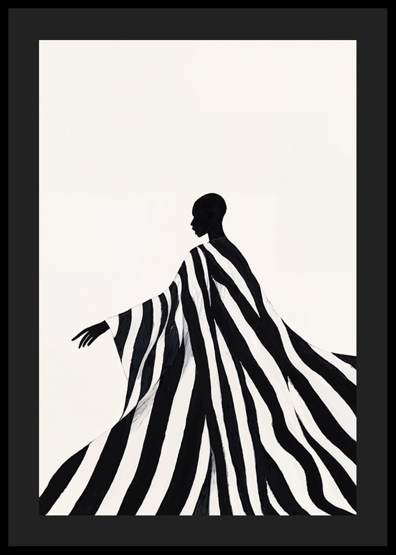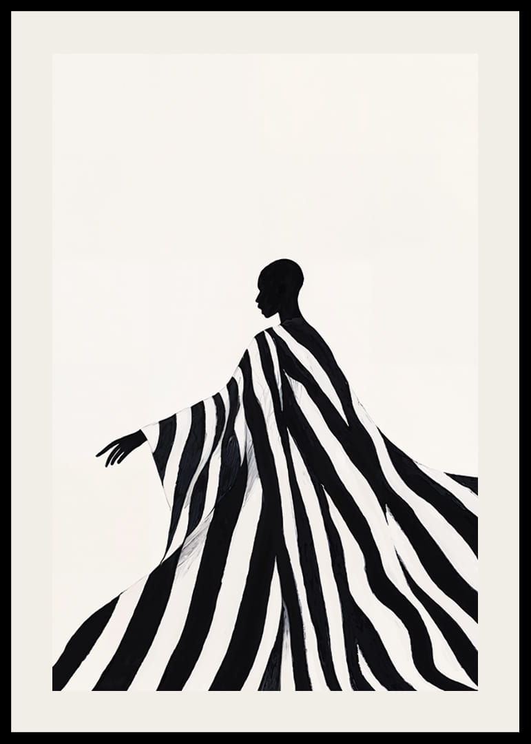 Denne plakaten fanger øyet med en elegant silhuett pakket inn i dynamiske svarte og hvite striper. Den minimalistiske komposisjonen gir en følelse av bevegelse og ynde, hvor kontrastene mellom lys og skygge skaper en magisk atmosfære.