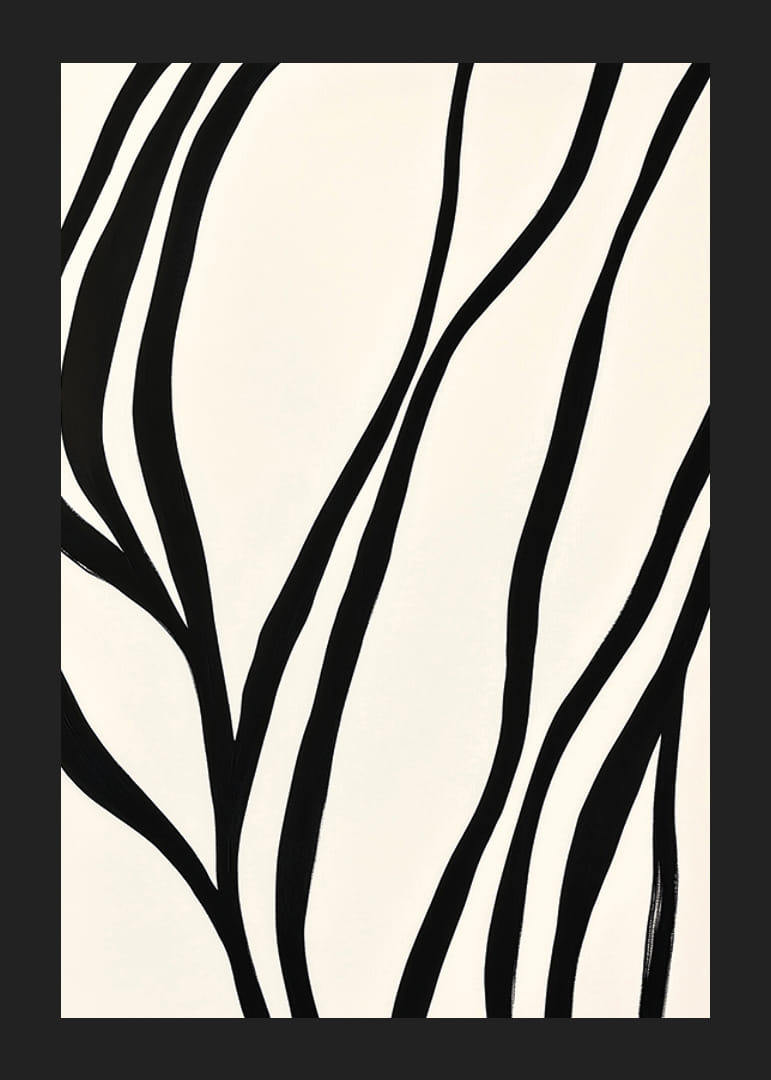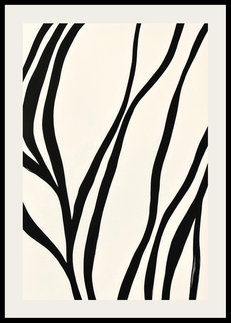 Denne plakaten fanger øyet med den elegante bevegelsen til de svarte linjene på en myk hvit bakgrunn. De bølgende mønstrene skaper en følelse av bevegelse og harmonisk balanse som forvandler hvert rom til et sted med ro og eleganse.