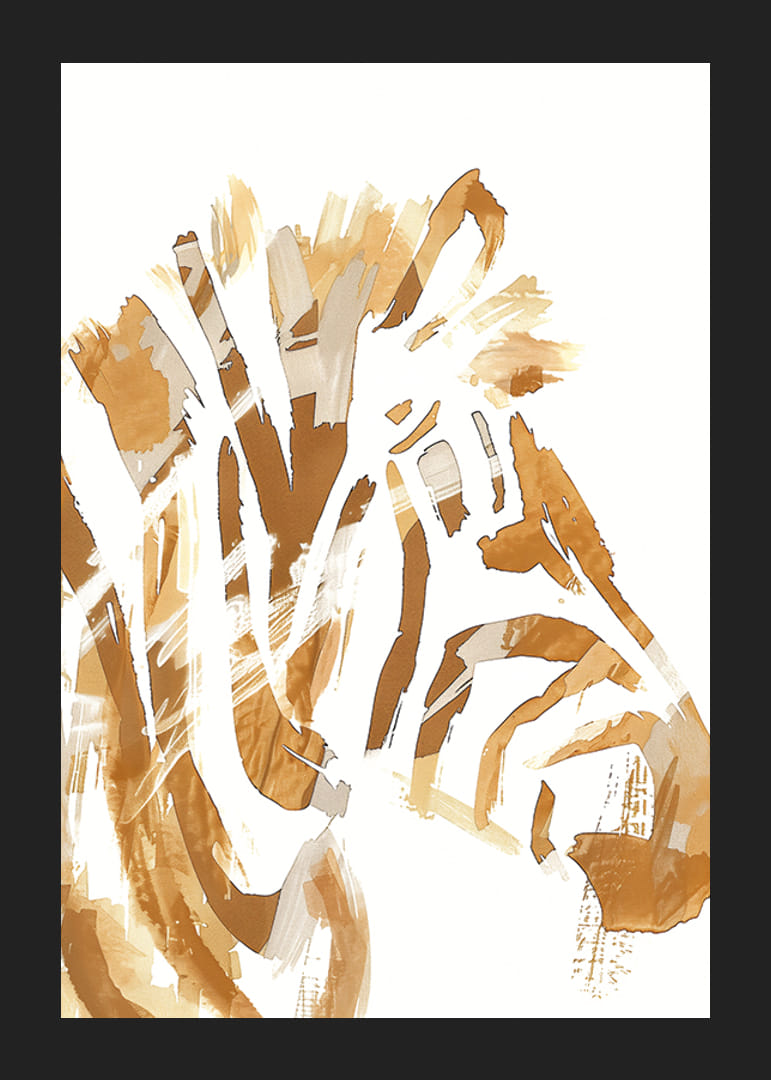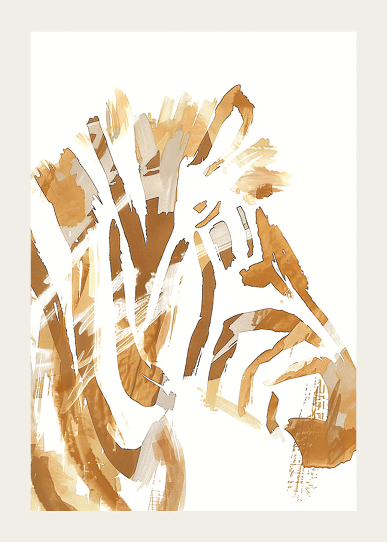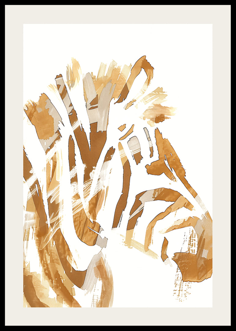 Denne plakaten fanger øyet med sin elegante tolkning av en hestemanke i jordnære bronsefarger. De feiende penselstrøkene skaper en følelse av bevegelse og frihet, og gir liv til rommet det pryder.