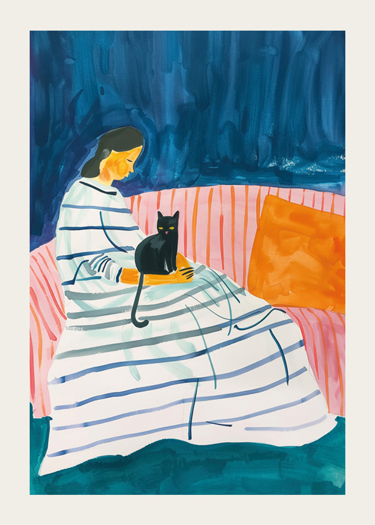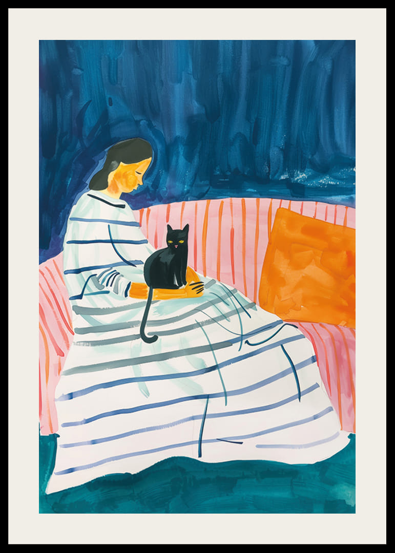 Denne plakaten fanger et mykt og fredelig øyeblikk der en kvinne sitter med en svart katt i fanget. De omkringliggende nyanser av blått og rosa skaper en varm atmosfære av ro og harmoni. Den stripete kjolen og den myke sofaen gir en følelse av komfort og nærhet.