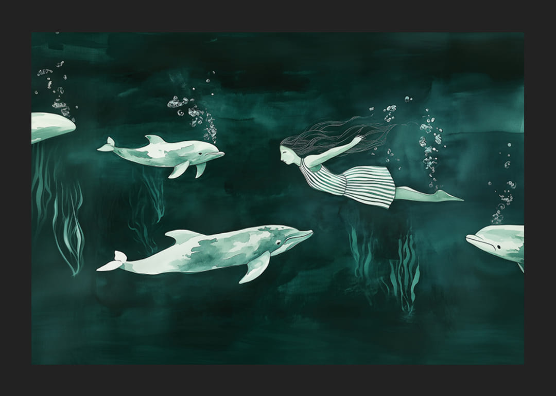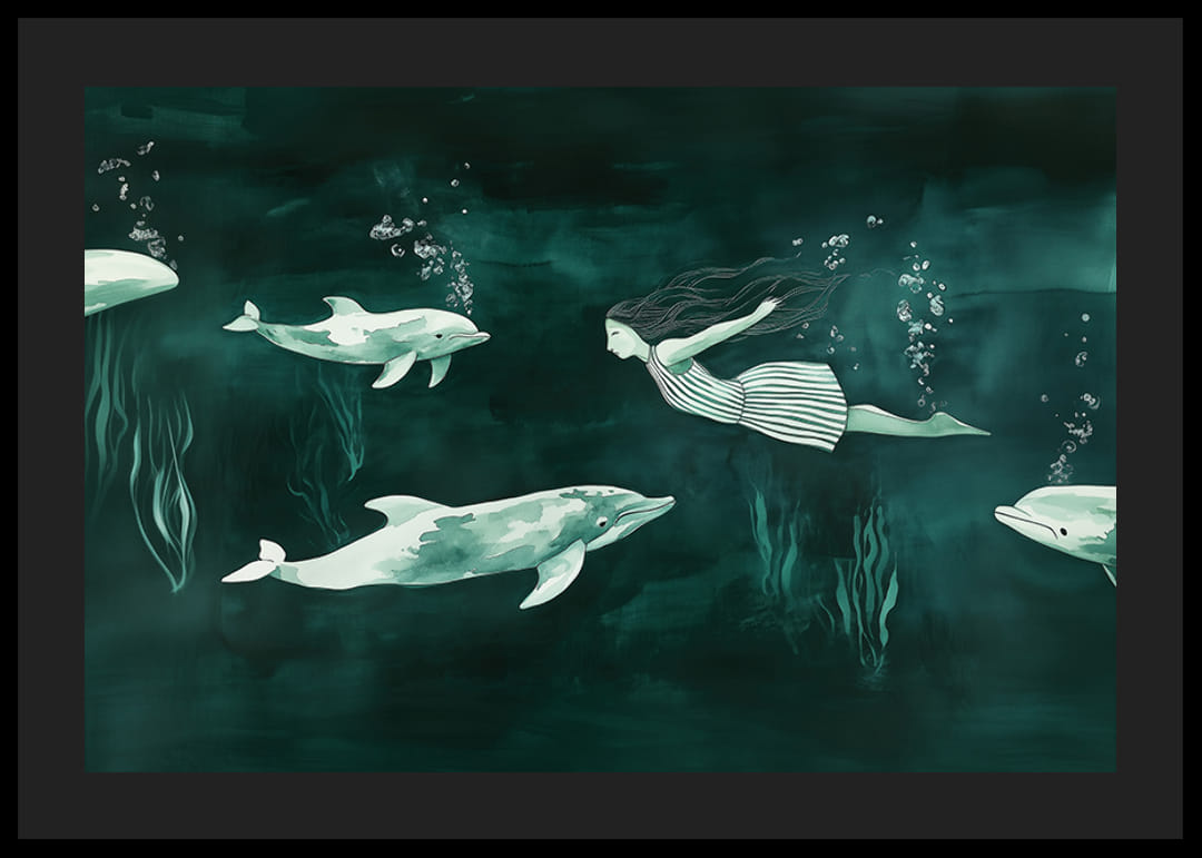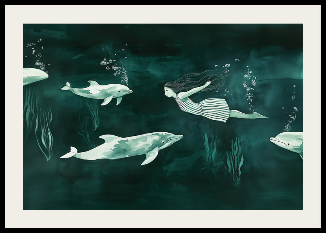 Denne plakaten fanger en drømmende undervannsverden der en havfrue svømmer harmonisk med delfiner. Fargene dypgrønt og skimrende blått skaper en rolig og magisk atmosfære. Delfinenes lekenhet og havfruenes elegante bevegelser gir en følelse av frihet og fantasi.