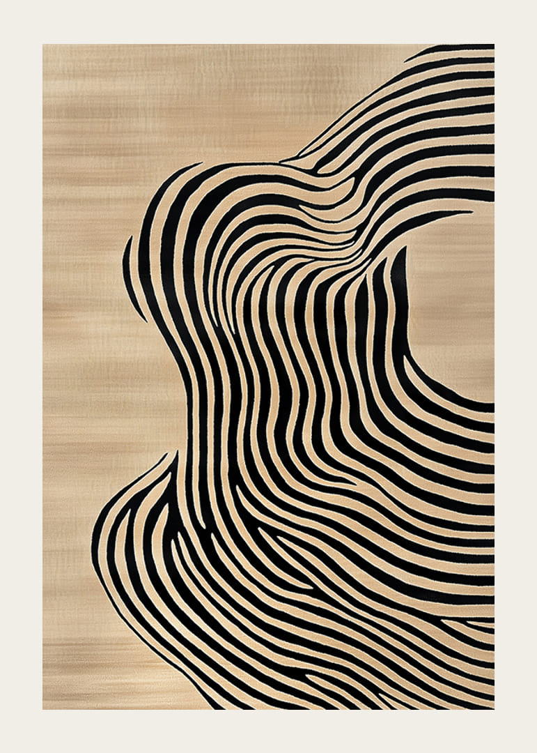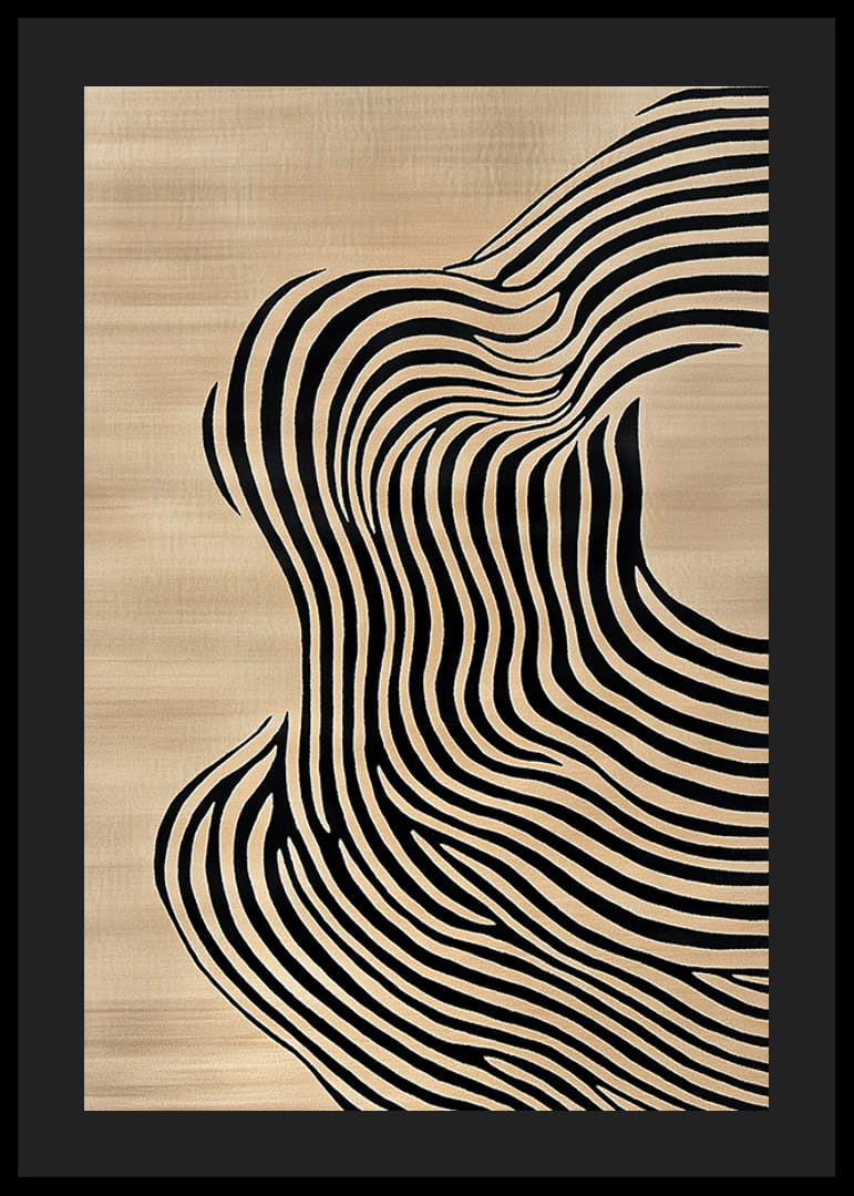 Denne plakaten fanger umiddelbart oppmerksomheten med sine svarte linjer som flyter mykt over en varm beige bakgrunn. Det skaper en følelse av bevegelse og flytende eleganse som inviterer til refleksjon.