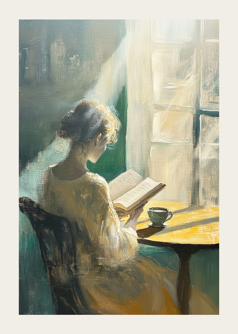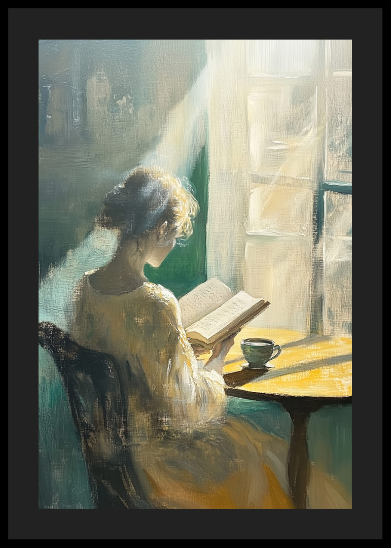 En kvinne sitter ved et lite bord, fanget i det myke morgenlyset som strømmer inn gjennom vinduet. Hun er dypt oppslukt av boken sin, og stillheten rundt henne forsterker mystikken. Denne plakaten utstråler ro og refleksjon, og fanger et øyeblikk av stillhet og introspeksjon. Perfekt for å skape en harmonisk og beroligende atmosfære i ethvert rom.