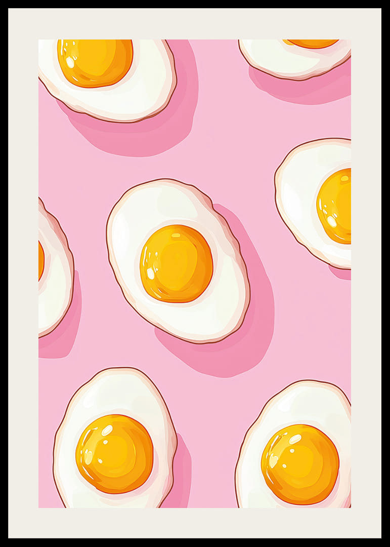 Denne plakaten fanger blikket med sine gylne eggeplommer som skinner mot en livlig rosa bakgrunn. De perfekt stekte eggene skaper et lekent mønster som vekker glede og lekenhet. Den myke kontrasten mellom den varme gule og den kjølige rosa fargen bringer en frisk og energisk atmosfære til ethvert rom. Med sitt unike design forvandler denne plakaten enhver vegg til et kreativt og levende sted.