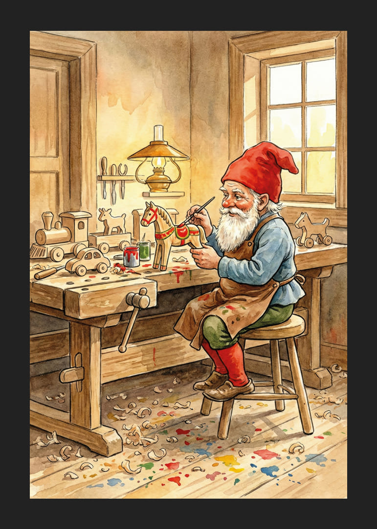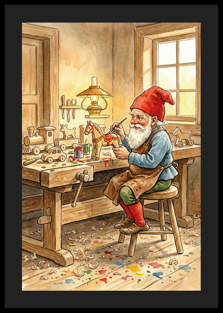 I dette fortryllende motivet ser vi en alv som med stor omhu maler en trehest i sitt koselige snekkerverksted. Lyset fra den gamle lampen skaper en varm og innbydende atmosfære der trespon dekker gulvet. Denne plakaten fanger håndverkets magi og skaper en følelse av nostalgi. Perfekt for å gi hjemmet ditt en hjemmekoselig og kreativ atmosfære. Plakatens sjarm beriker ethvert rom med et snev av tradisjon.
