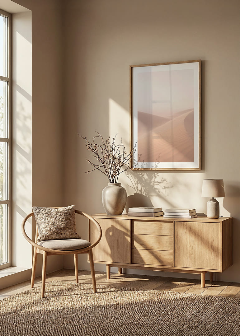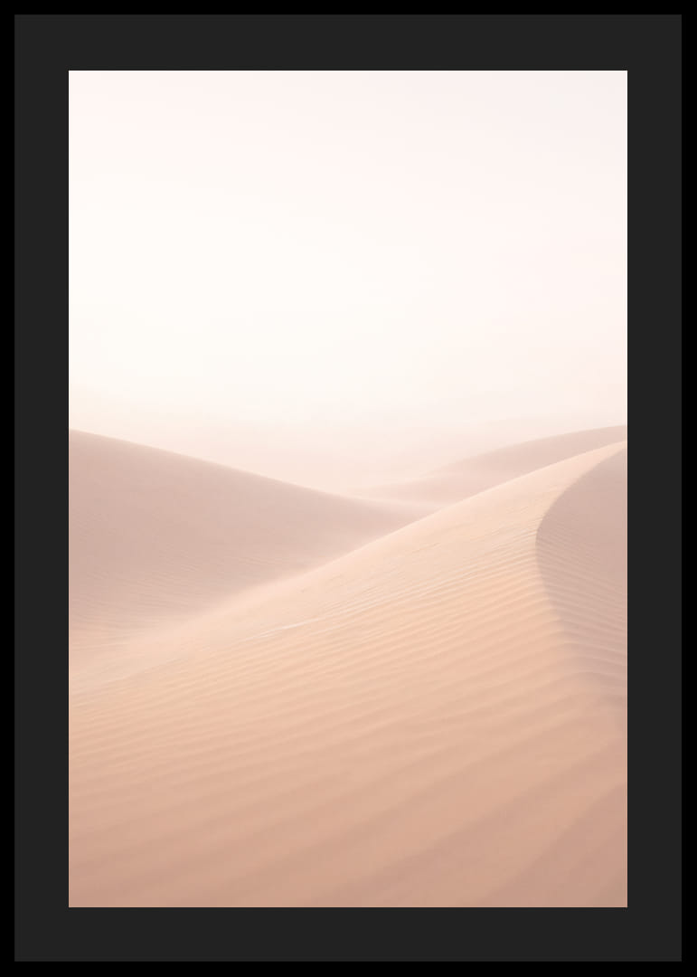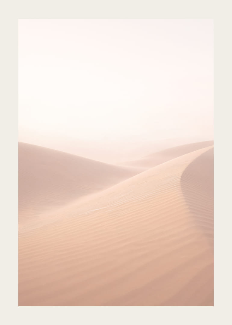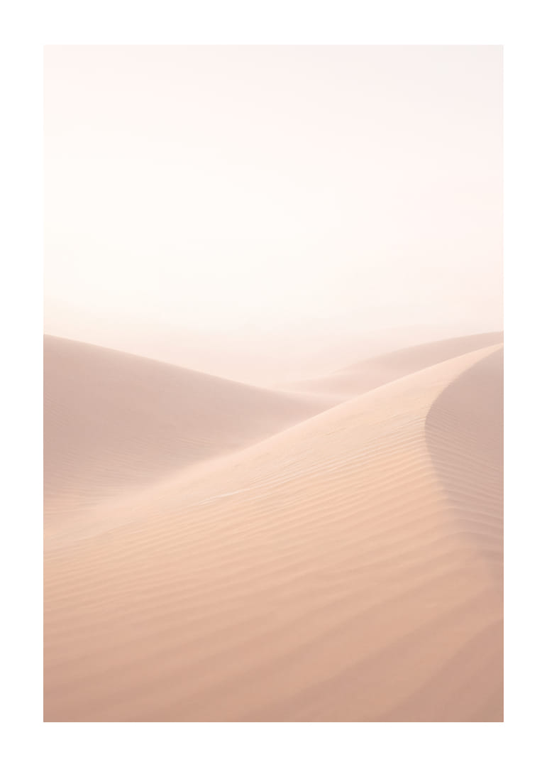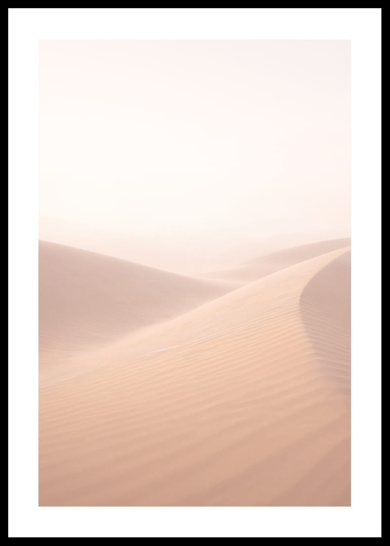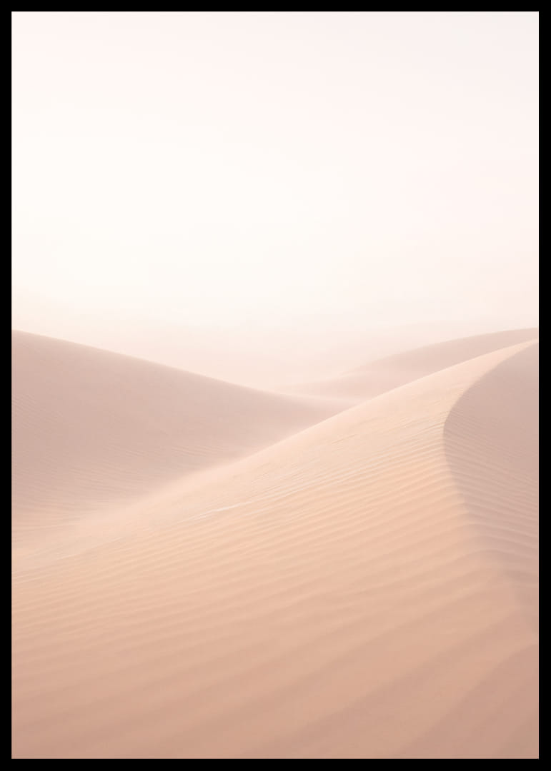 Denne plakaten fanger blikket med sine myke, rosa sanddyner som strekker seg bak horisonten. Det subtile lyset og de milde skyggene skaper en følelse av fred og drømmende stillhet. Plakatens beroligende fargepalett skaper et harmonisk og avslappende element i ethvert rom, perfekt for å skape en fredelig oase der hjemmeinnredningen din får et snev av naturens fredelige skjønnhet.