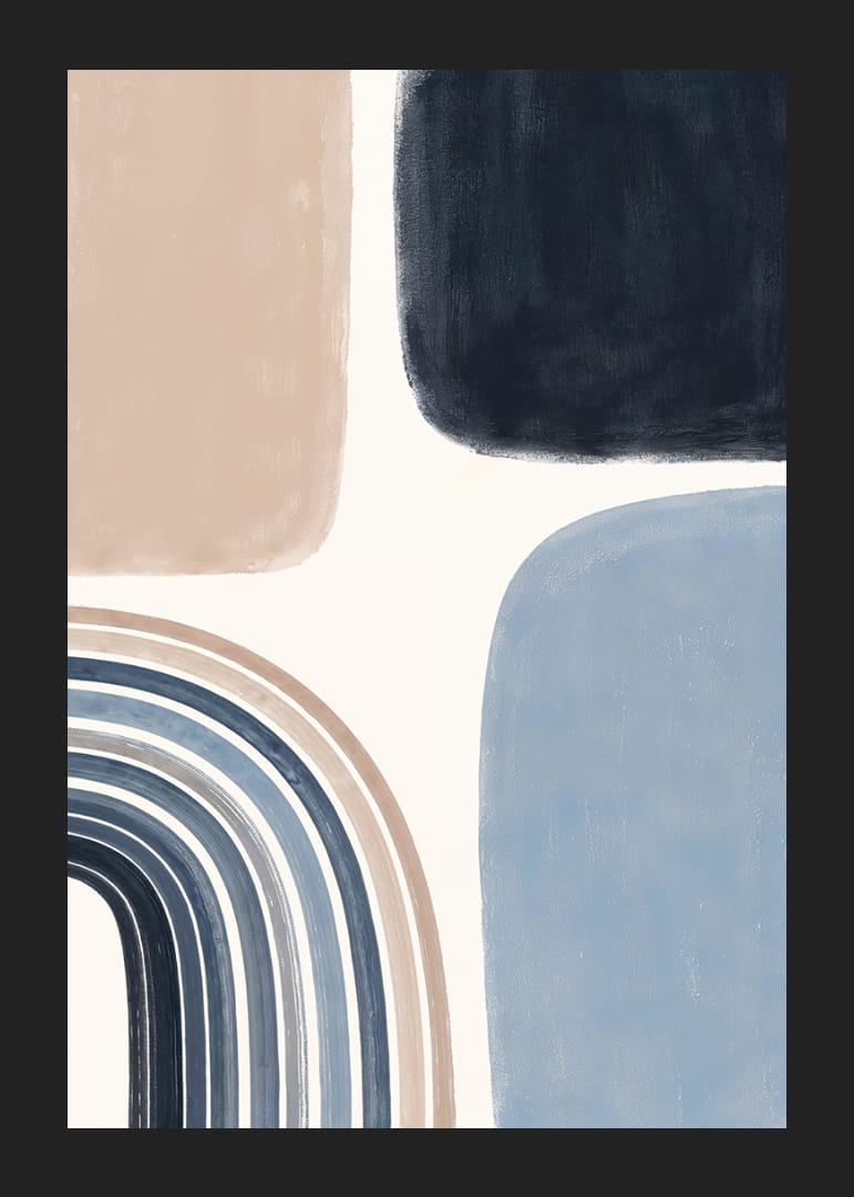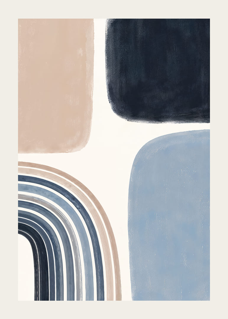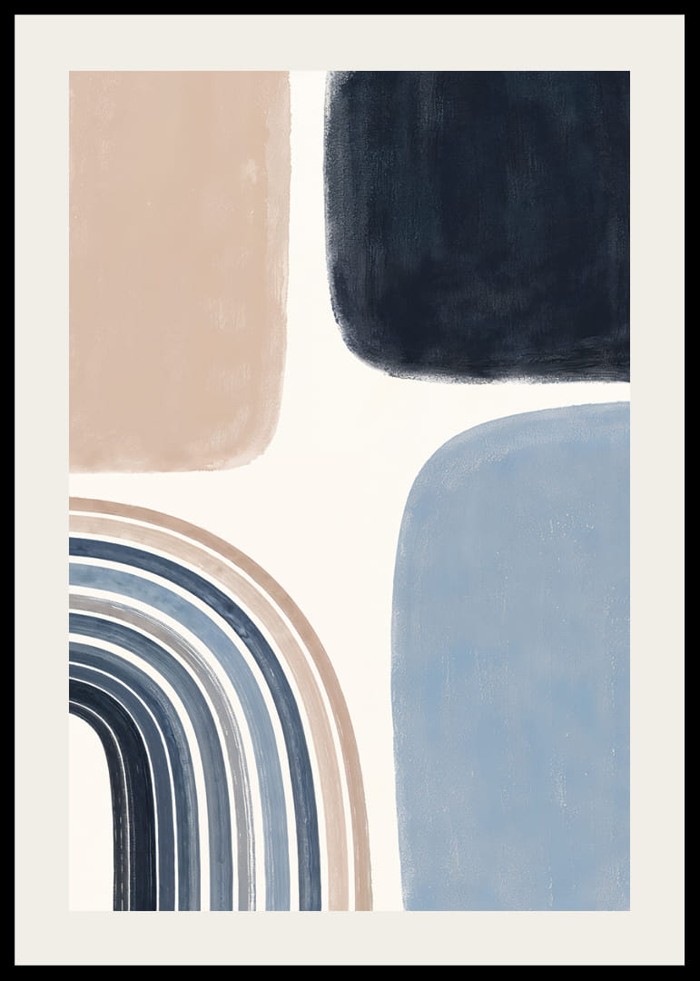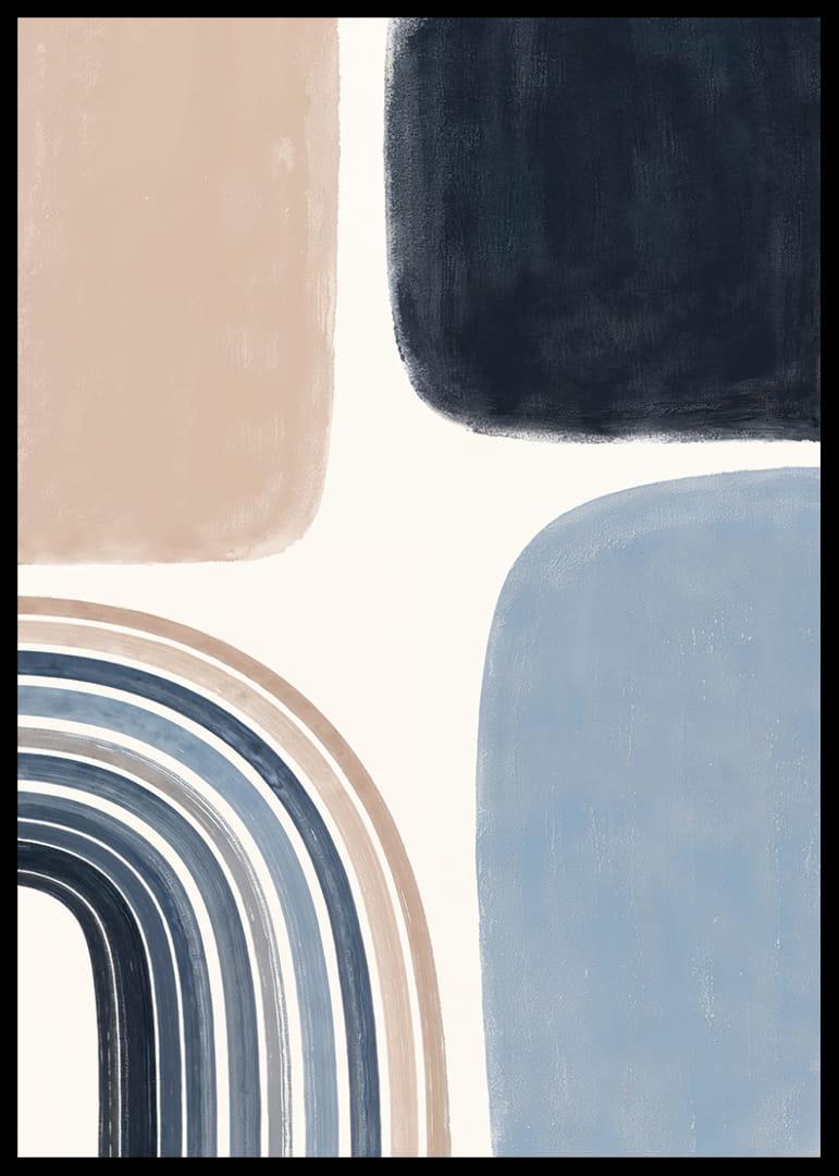 Denne plakaten formidler en umiddelbar følelse av ro gjennom sine myke farger og bølgende former. De harmoniske nyansene av beige, blå og mørkegrå samhandler for å skape en subtil, men likevel kraftfull visuell effekt. Plakaten tilfører et element av stilig enkelhet som beriker ethvert rom med en følelse av balanse og ro. Perfekt for å forvandle ethvert miljø til en oase av ro.