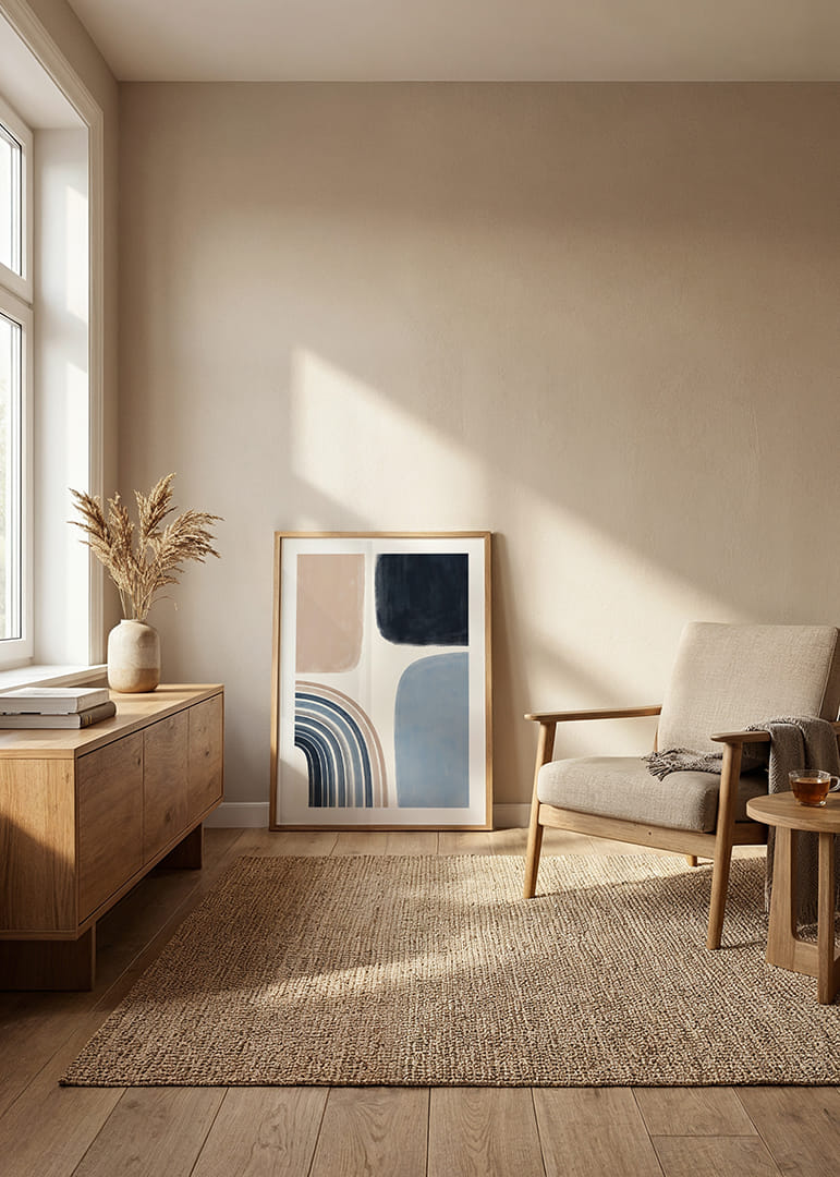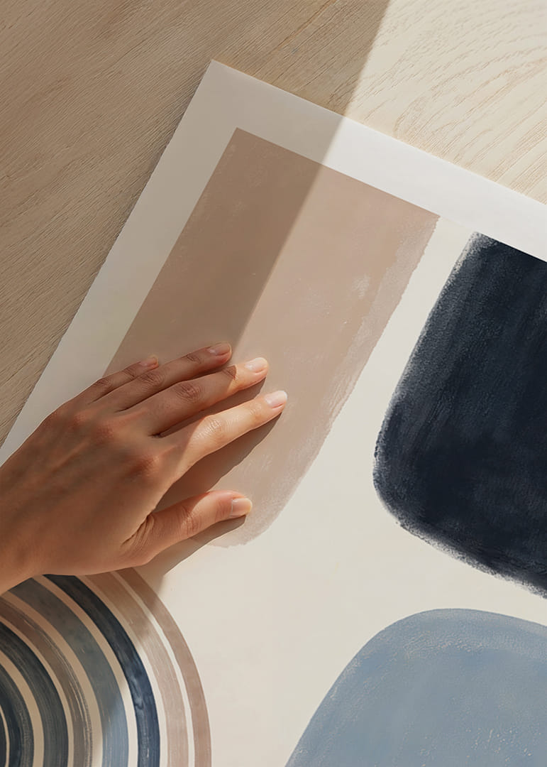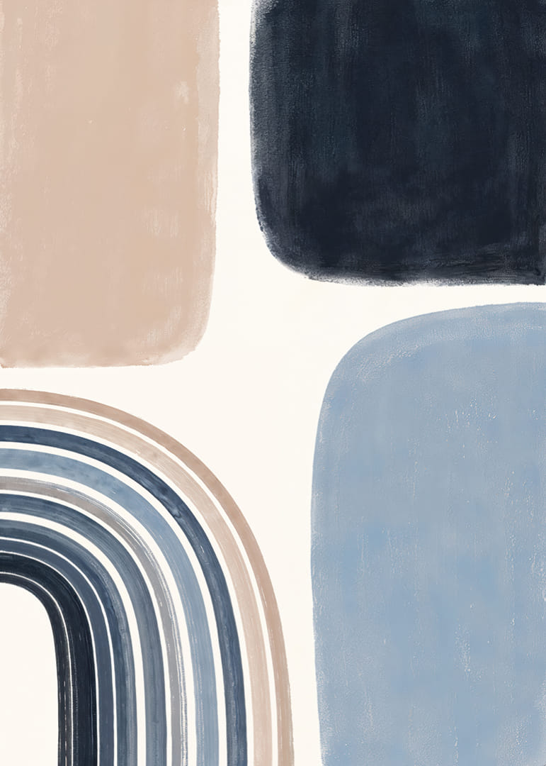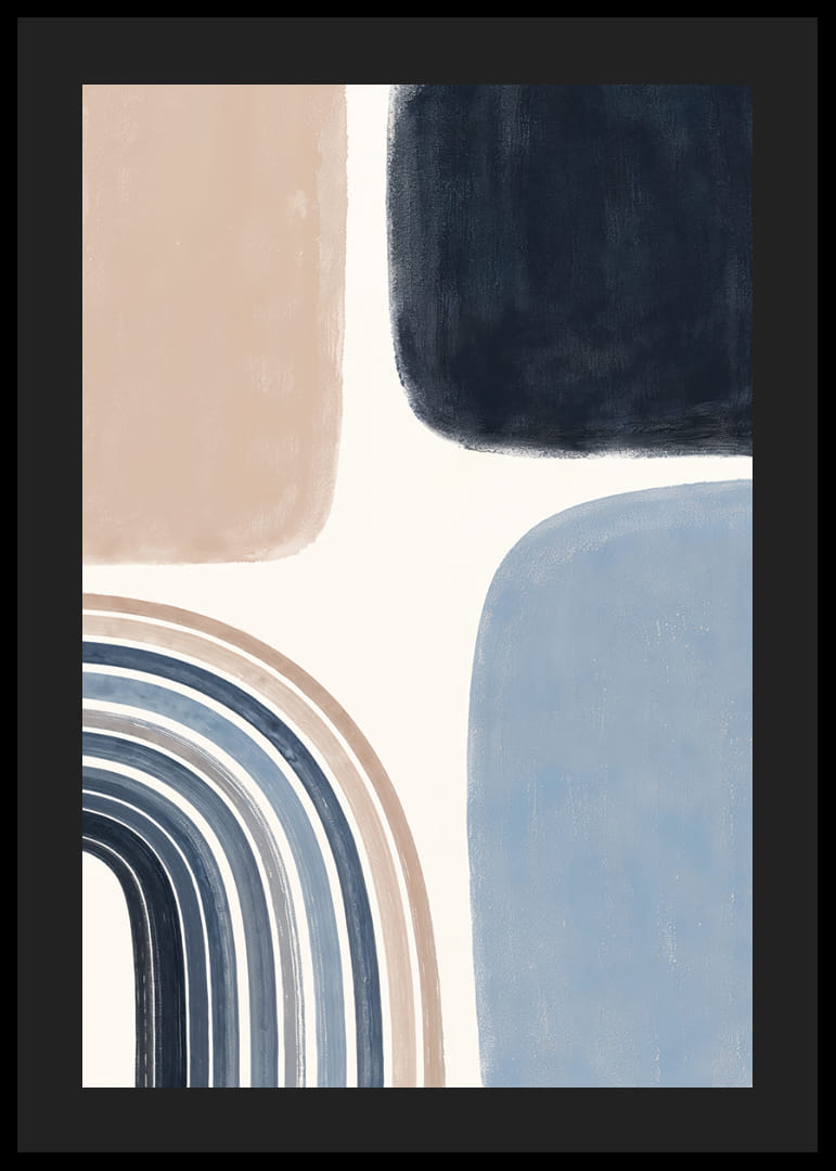 Denne plakaten formidler en umiddelbar følelse av ro gjennom sine myke farger og bølgende former. De harmoniske nyansene av beige, blå og mørkegrå samhandler for å skape en subtil, men likevel kraftfull visuell effekt. Plakaten tilfører et element av stilig enkelhet som beriker ethvert rom med en følelse av balanse og ro. Perfekt for å forvandle ethvert miljø til en oase av ro.