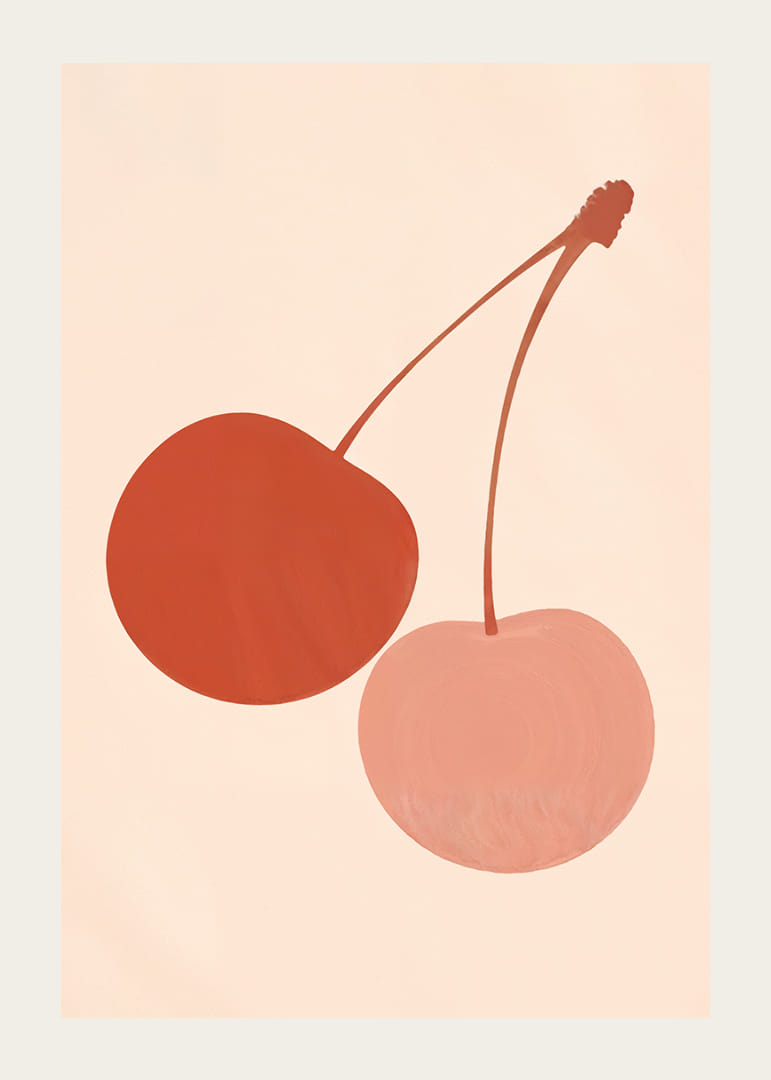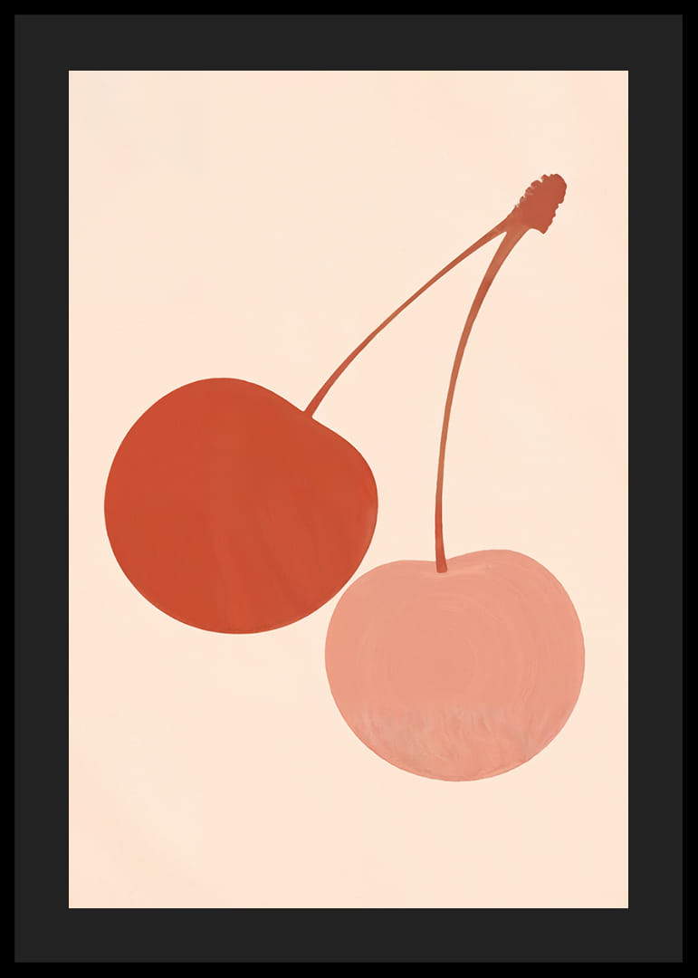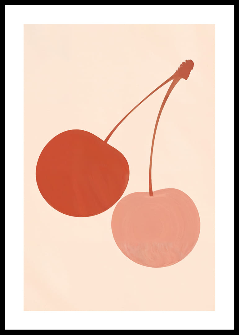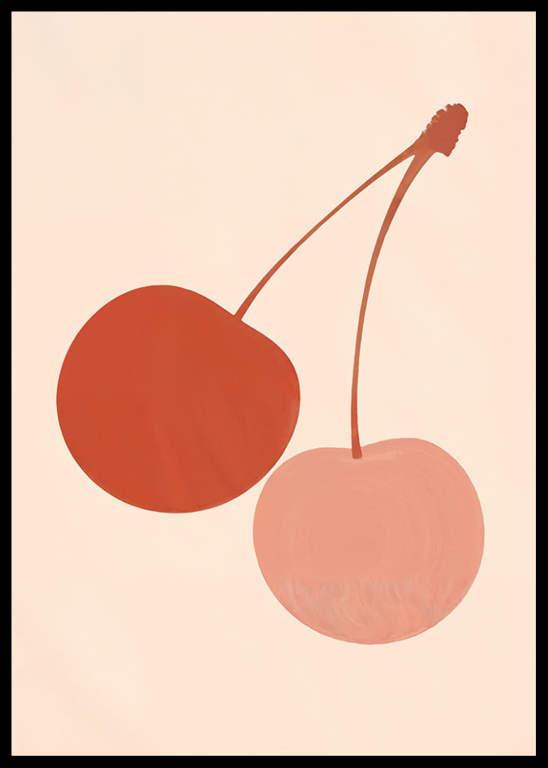 Denne plakaten fanger blikket med sine to stiliserte kirsebær i beroligende jordfarger mot en myk, nøytral bakgrunn. De dempede fargene skaper en harmonisk følelse som gjennomsyrer hele rommet. Plakaten kombinerer kunstnerisk eleganse med enkelhet, noe som gjør den til et perfekt tilskudd til enhver moderne stue eller kjøkken, hvor den bidrar med både stil og ro.