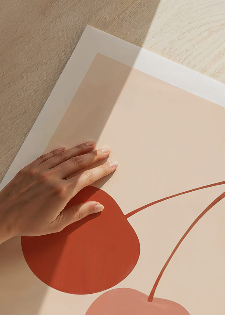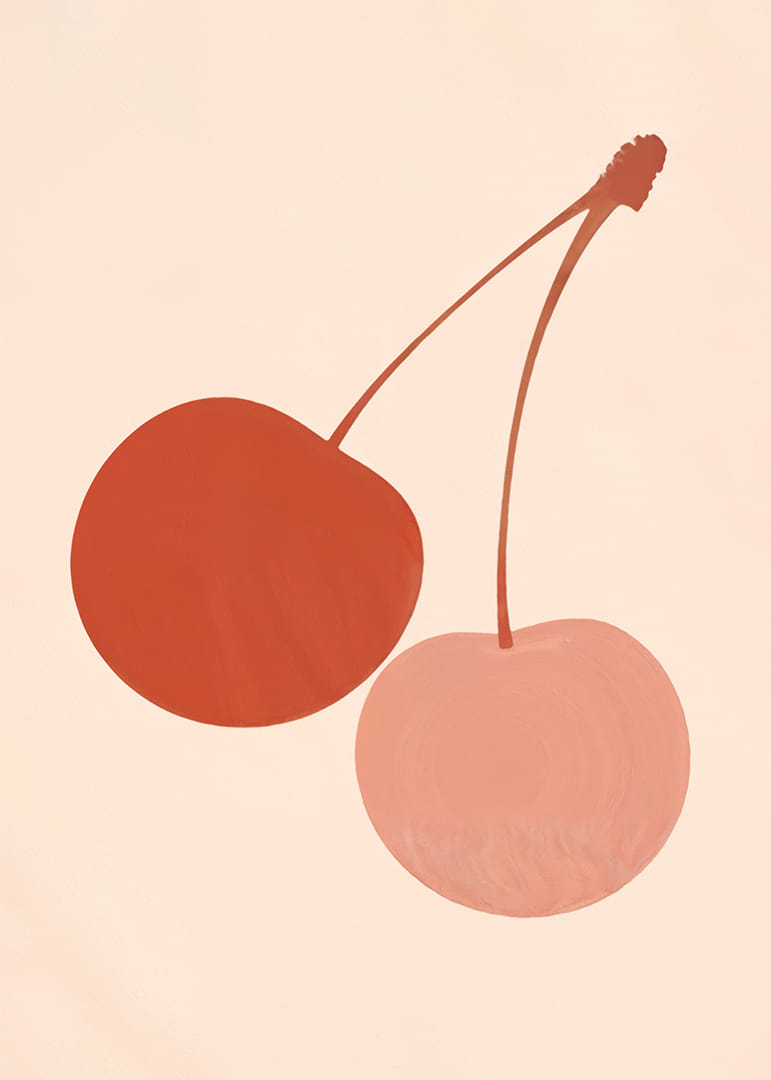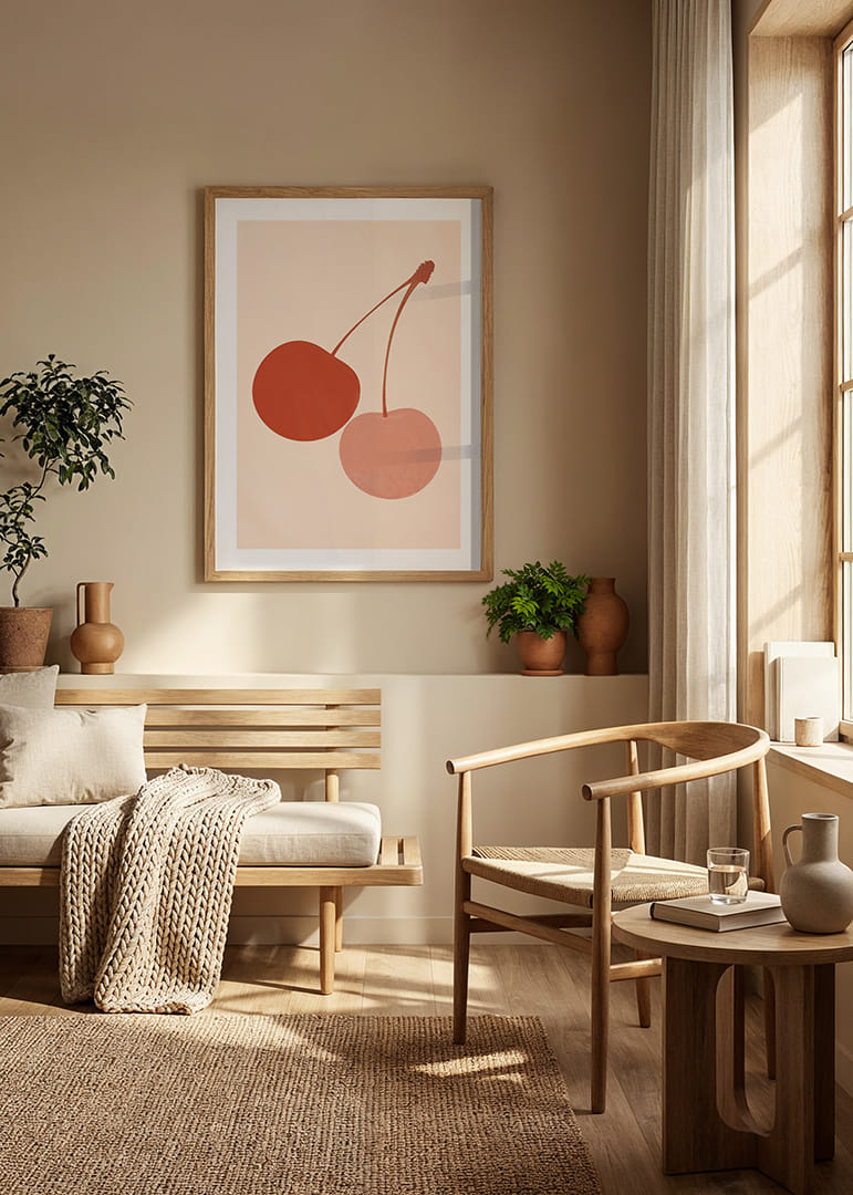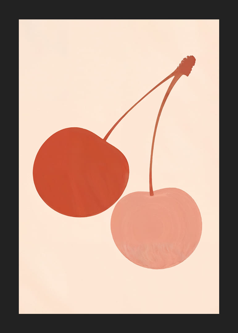 Denne plakaten fanger blikket med sine to stiliserte kirsebær i beroligende jordfarger mot en myk, nøytral bakgrunn. De dempede fargene skaper en harmonisk følelse som gjennomsyrer hele rommet. Plakaten kombinerer kunstnerisk eleganse med enkelhet, noe som gjør den til et perfekt tilskudd til enhver moderne stue eller kjøkken, hvor den bidrar med både stil og ro.