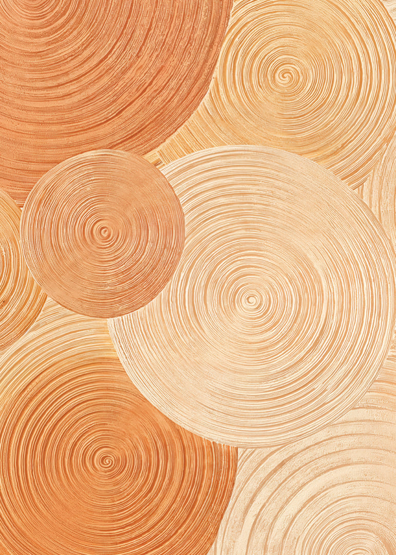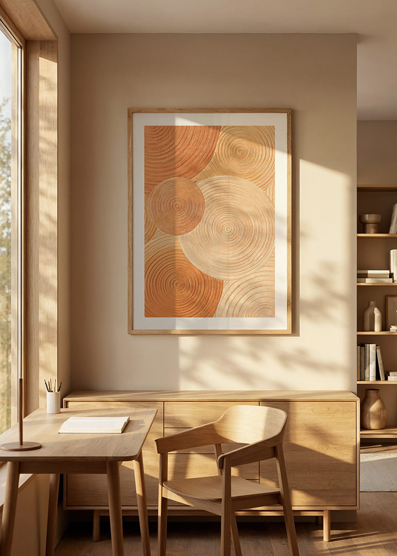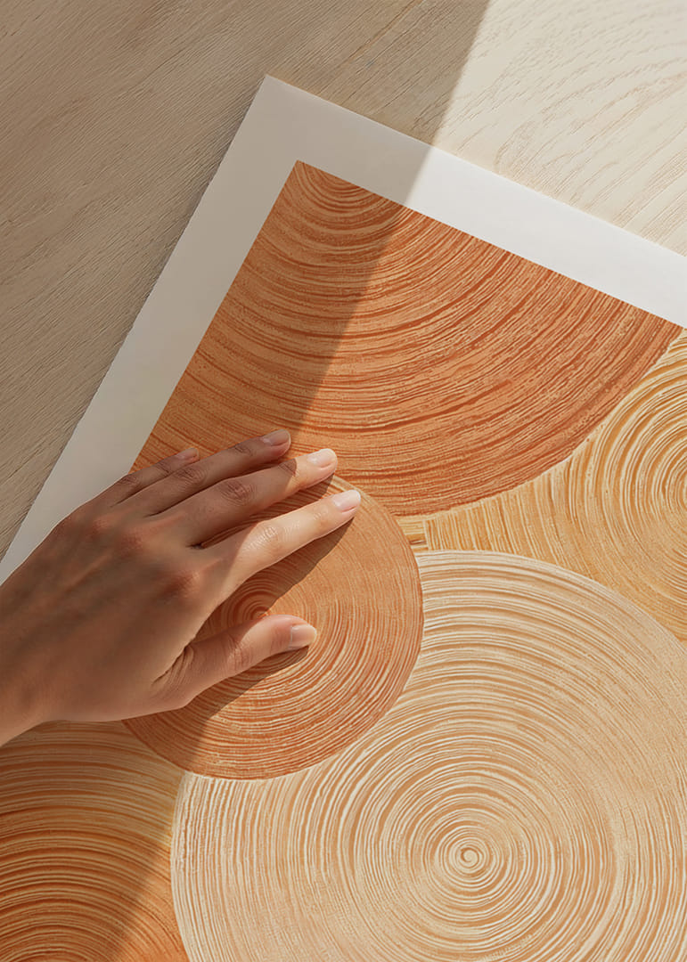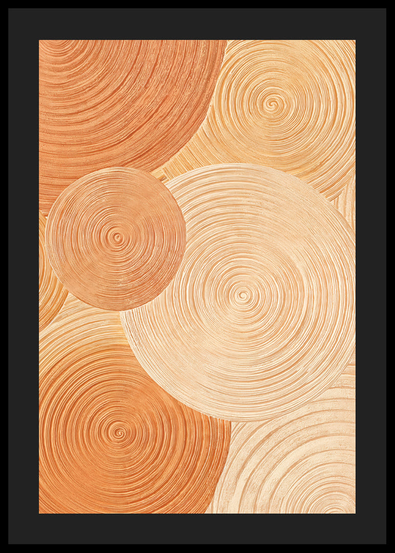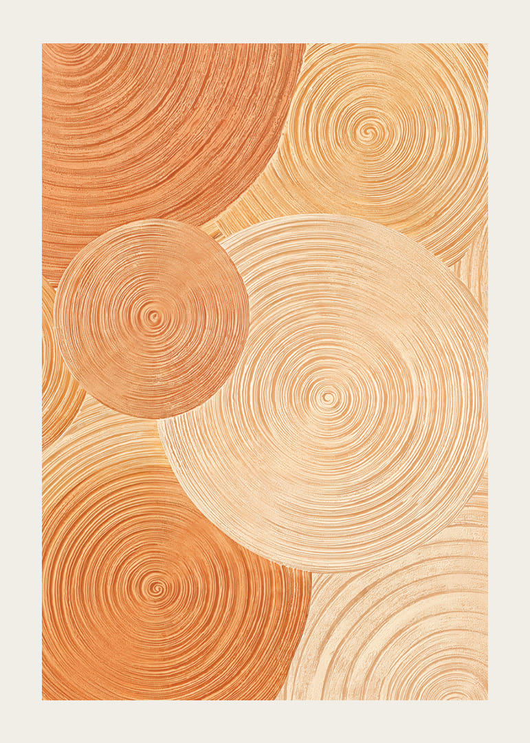 Denne plakaten fanger blikket med sine myke, sirkulære mønstre som danser i jordnære toner av gull og kobber. Hver sirkel virvler rundt med energi samtidig som den utstråler ro og balanse. Plakatens varme og harmoni inviterer deg til en fredelig atmosfære og er et perfekt element for å forskjønne ethvert rom. Det kunstferdige mønsteret gir et stilig og sofistikert preg til hjemmet ditt.