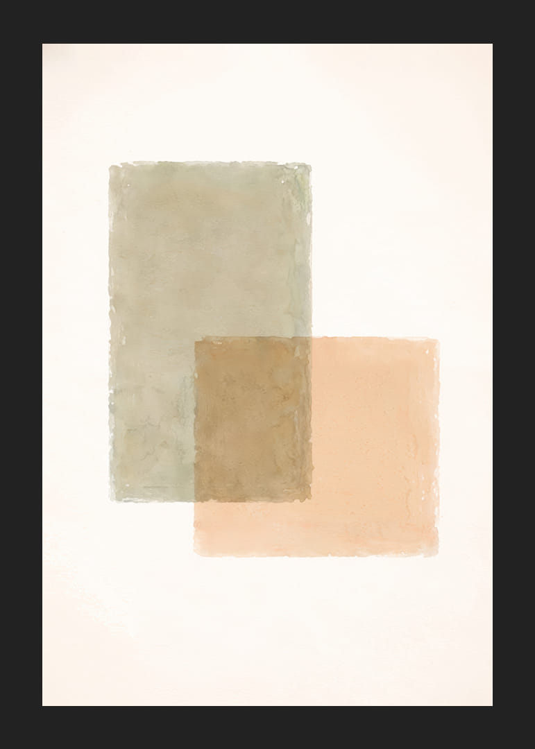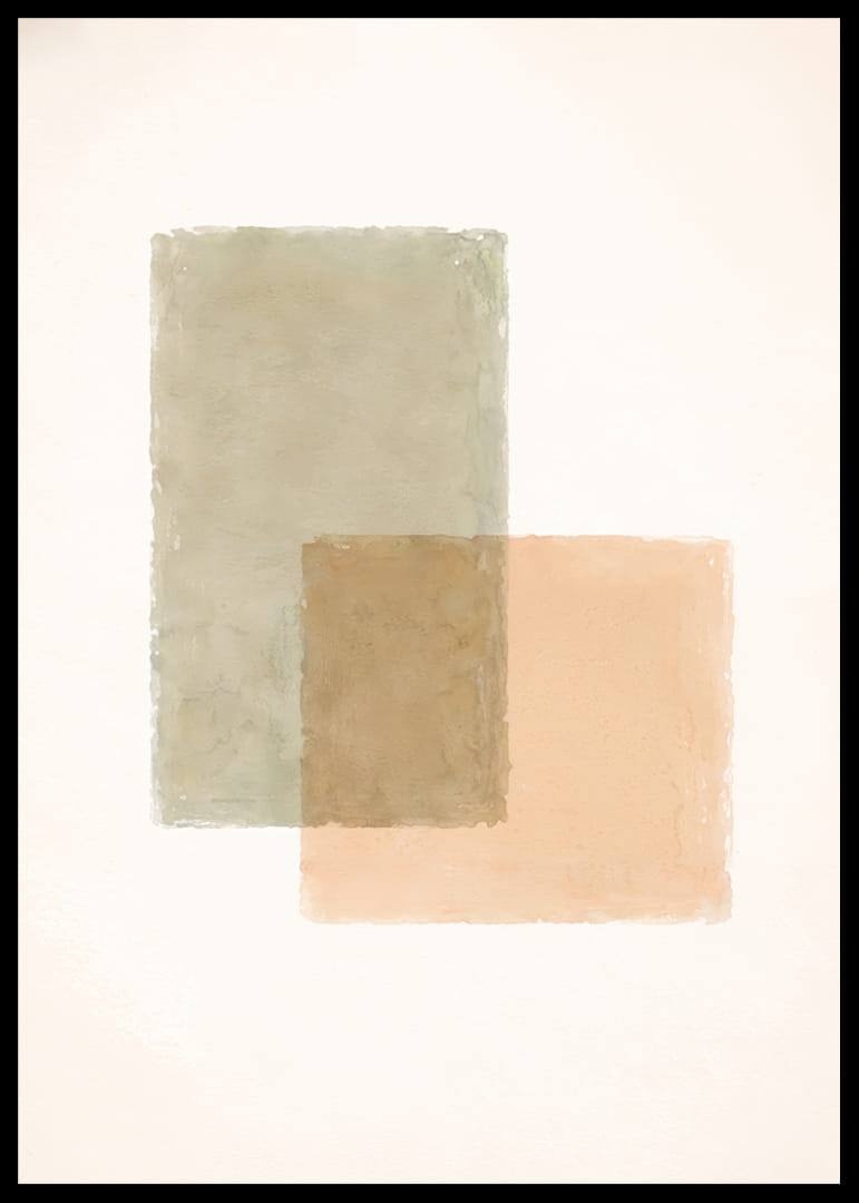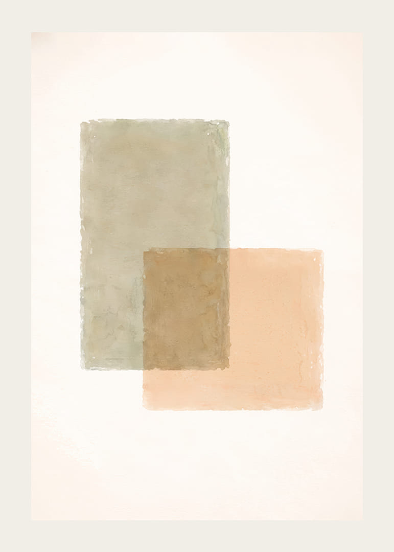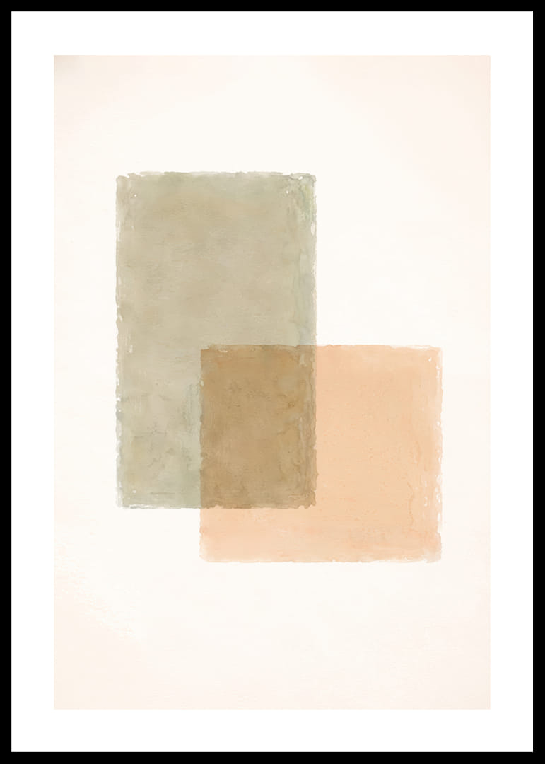 En plakat med et rolig og harmonisk uttrykk der dempede, myke farger blander seg i subtile overlapp. Den pastellfargede komposisjonen formidler en følelse av ro og tidløs eleganse, perfekt for å skape balanse og ro i ethvert rom. Plakaten fungerer som et beroligende visuelt punkt som myker opp og forfiner atmosfæren, og fremhever skjønnheten i enkelhet og subtilitet.