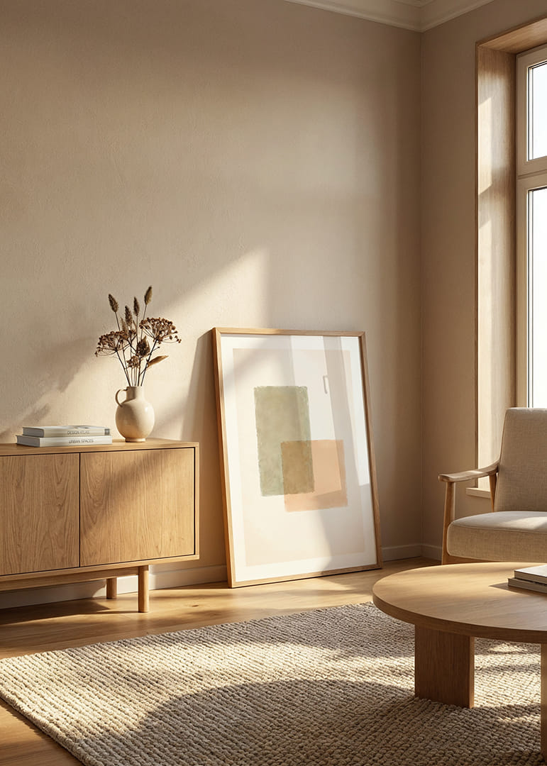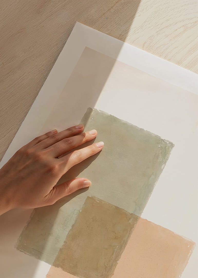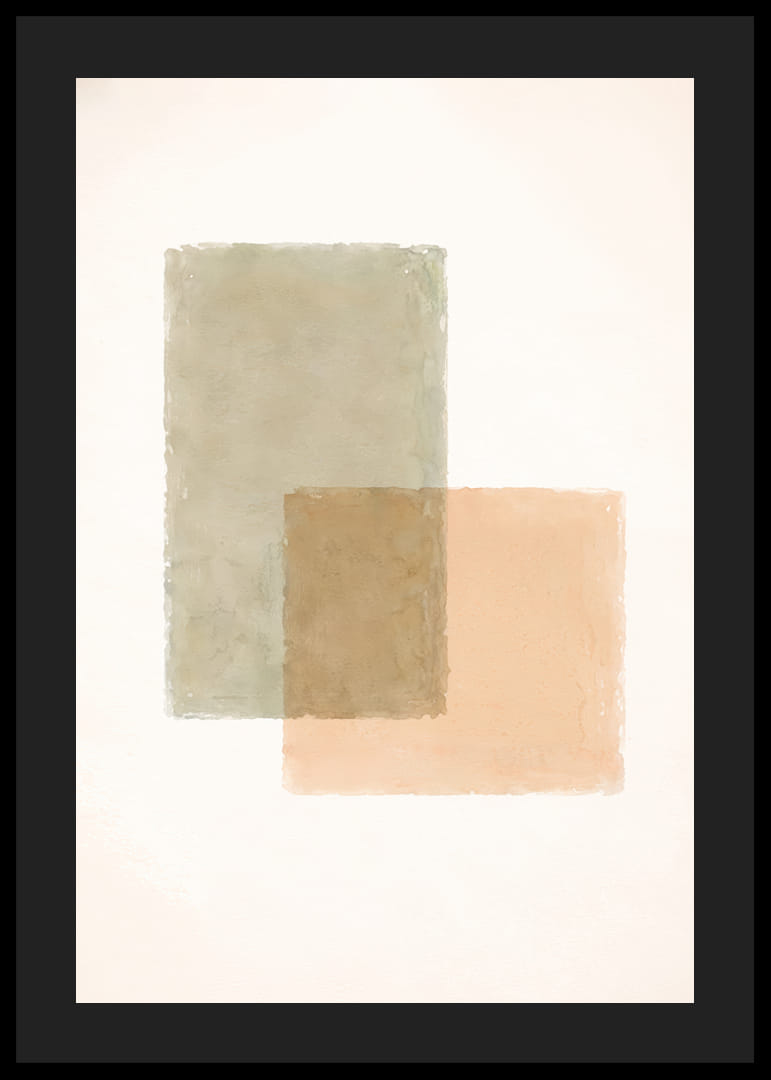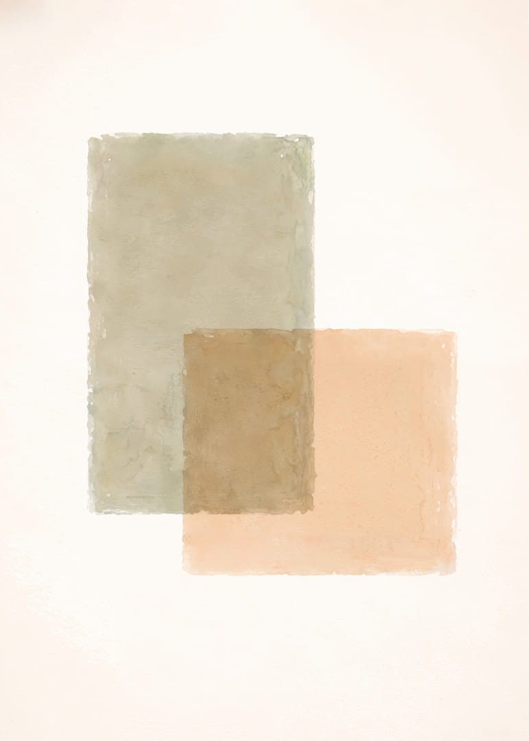 En plakat med et rolig og harmonisk uttrykk der dempede, myke farger blander seg i subtile overlapp. Den pastellfargede komposisjonen formidler en følelse av ro og tidløs eleganse, perfekt for å skape balanse og ro i ethvert rom. Plakaten fungerer som et beroligende visuelt punkt som myker opp og forfiner atmosfæren, og fremhever skjønnheten i enkelhet og subtilitet.