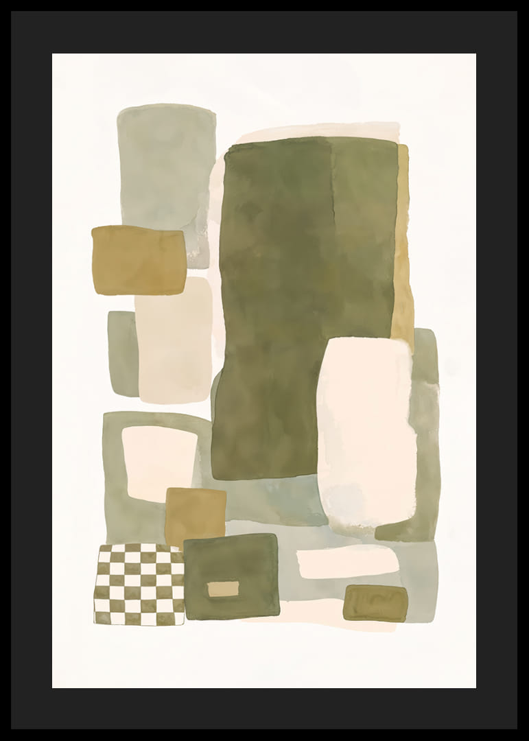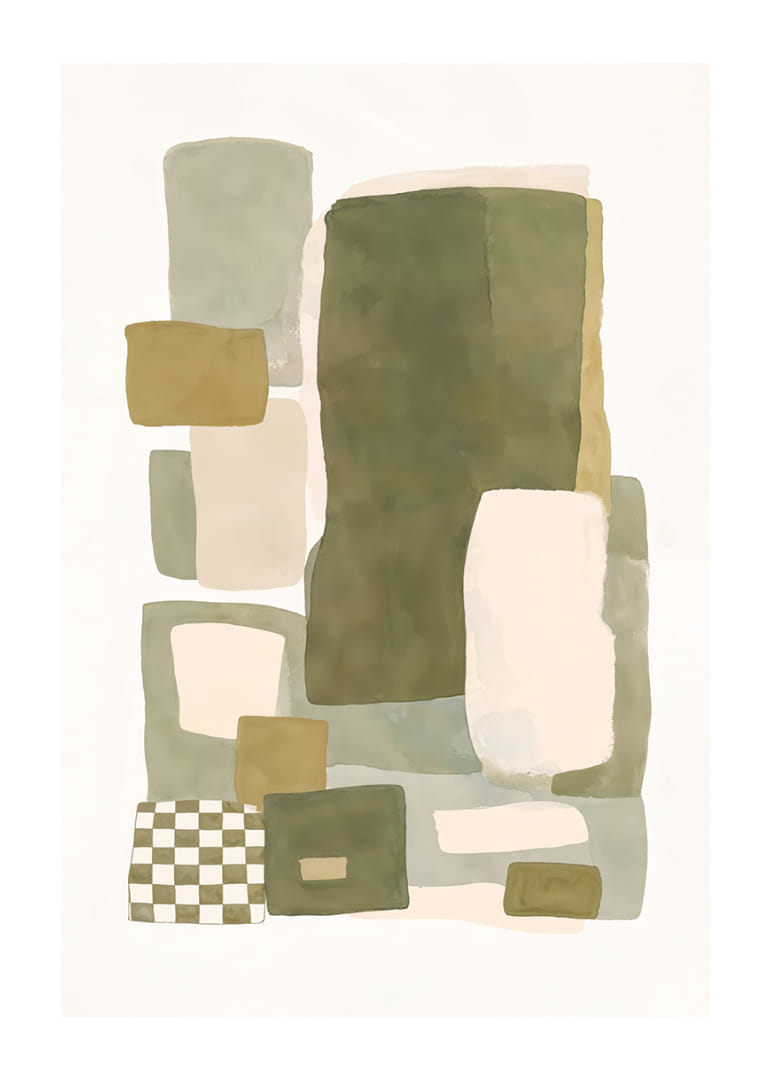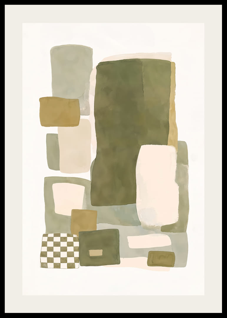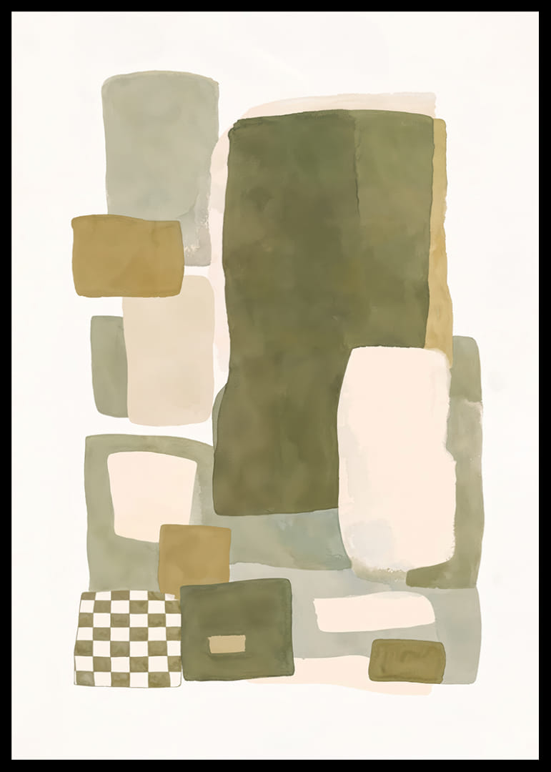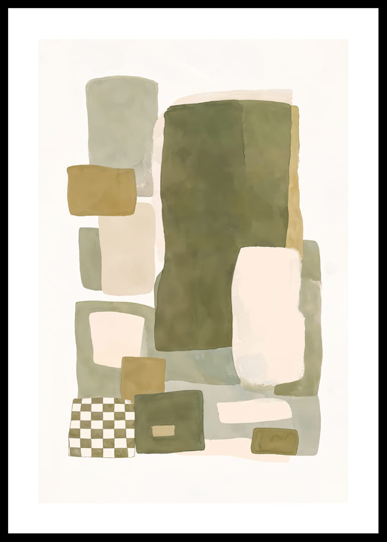 Opplev den myke balansen mellom farge og form i denne plakaten, hvor dempede nyanser av grønt og beige møtes i en harmonisk dans. Den abstrakte komposisjonen av rektangler og firkanter skaper en følelse av både ro og struktur. Denne plakaten vil være en perfekt detalj for å forsterke elegansen i hjemmet ditt og gi rommet en hyggelig og stilig atmosfære. La plakaten bli ett med interiøret ditt.