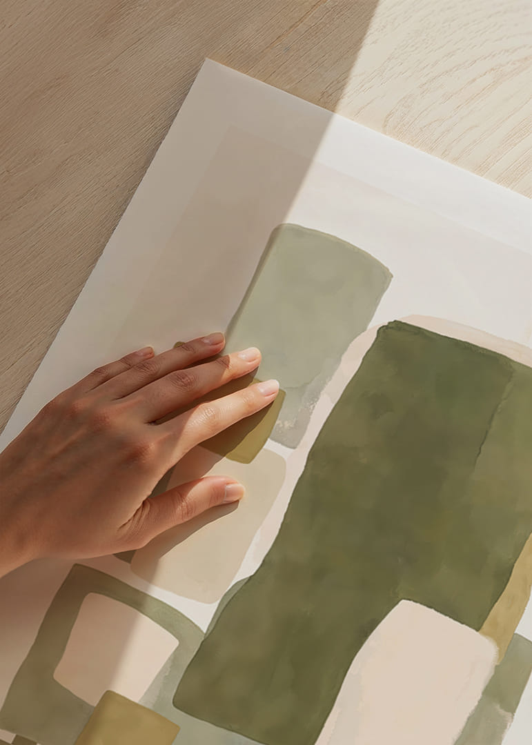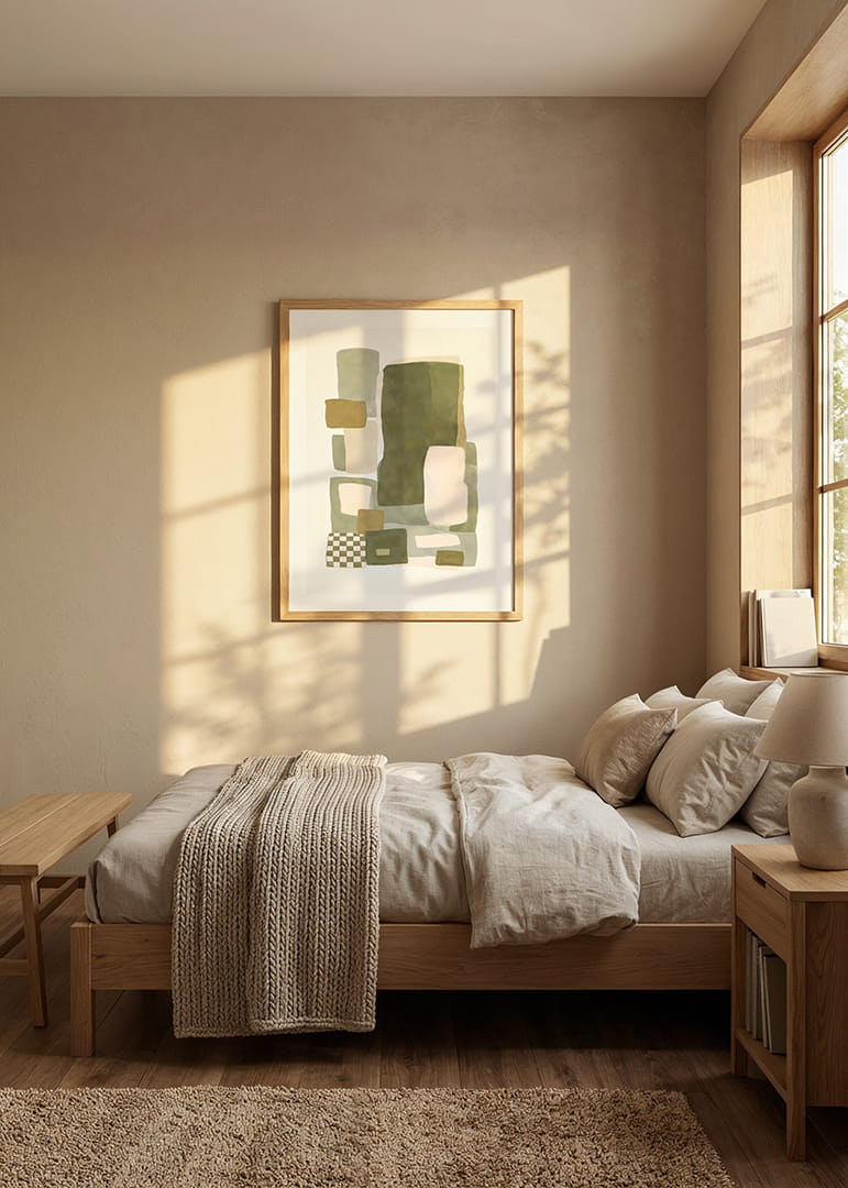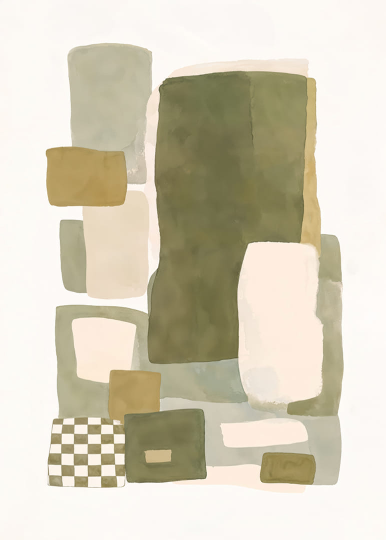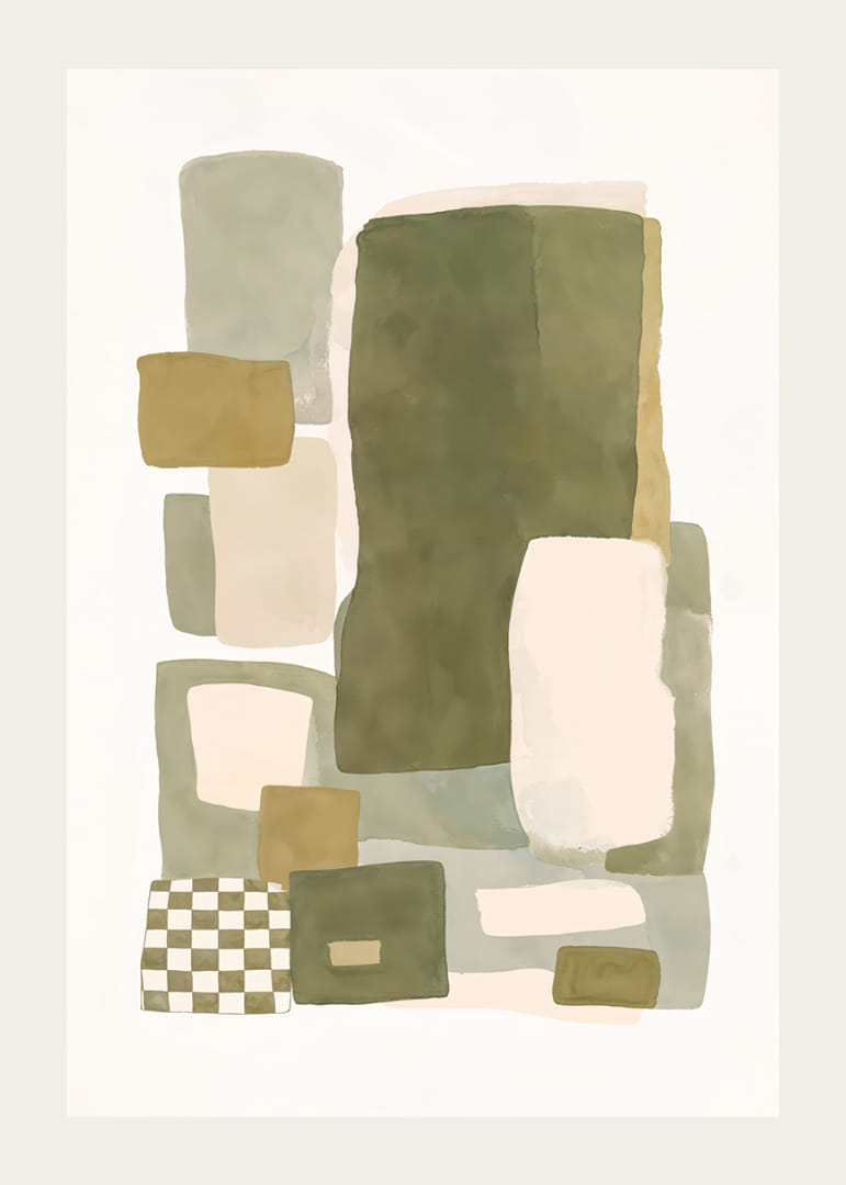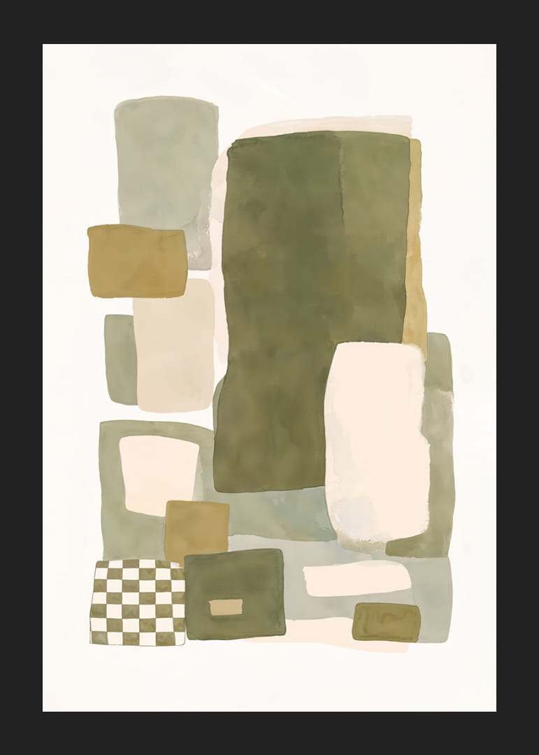 Opplev den myke balansen mellom farge og form i denne plakaten, hvor dempede nyanser av grønt og beige møtes i en harmonisk dans. Den abstrakte komposisjonen av rektangler og firkanter skaper en følelse av både ro og struktur. Denne plakaten vil være en perfekt detalj for å forsterke elegansen i hjemmet ditt og gi rommet en hyggelig og stilig atmosfære. La plakaten bli ett med interiøret ditt.