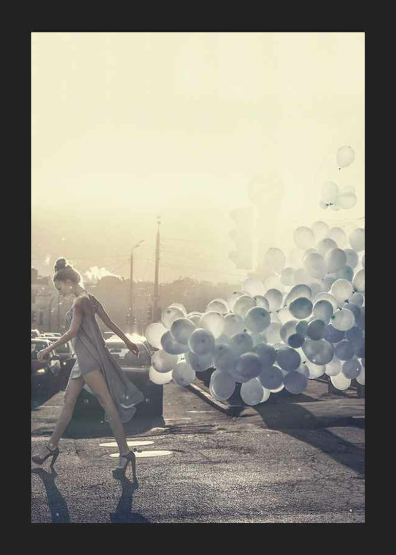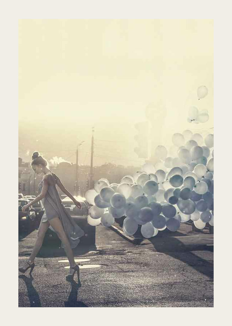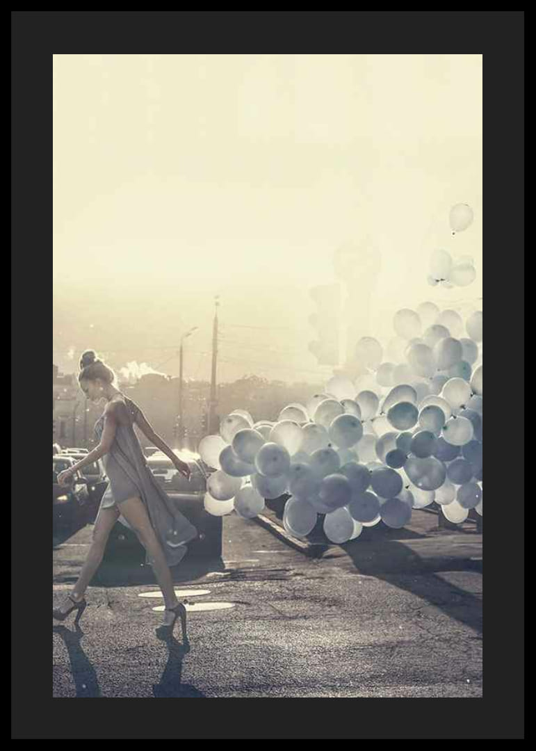 En kvinne i en lysegrå kjole og høye hæler går over en solfylt bygate mens en stor mengde blå ballonger svever bak henne. Mykt motlys og en disig bakgrunn gir bildet et moderne, nesten drømmende preg. Denne plakaten tilfører en lys og stilig atmosfære til en stue eller gang.