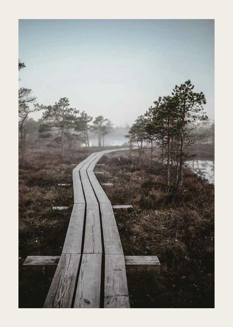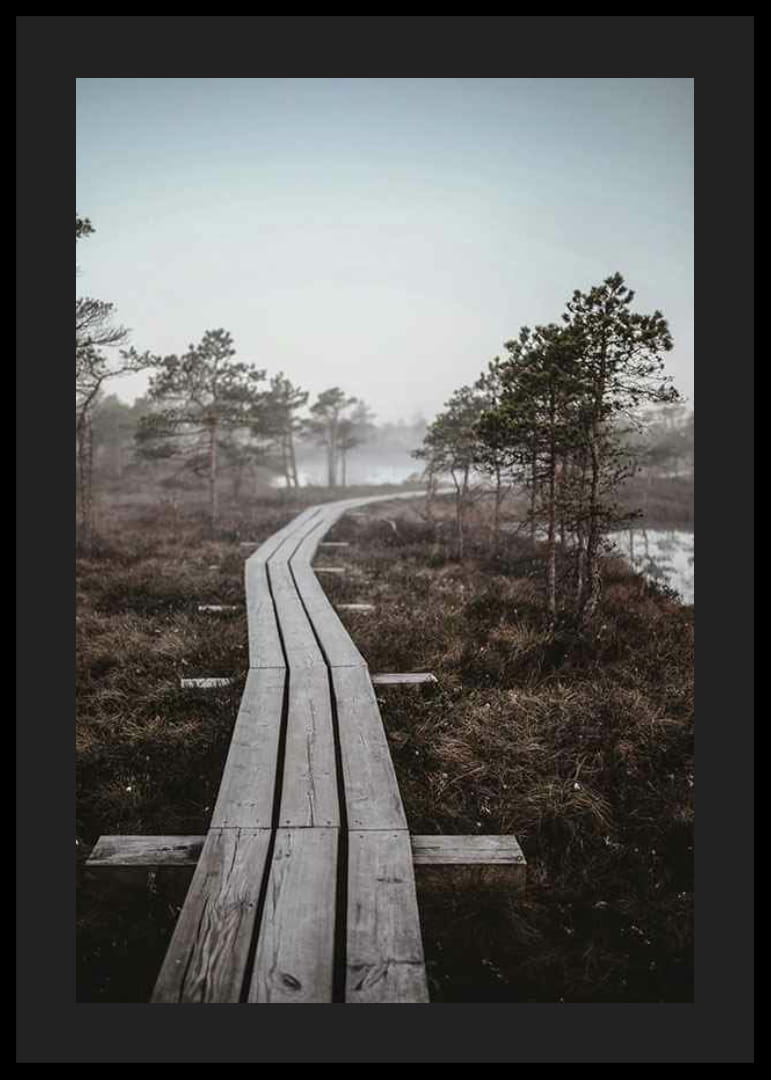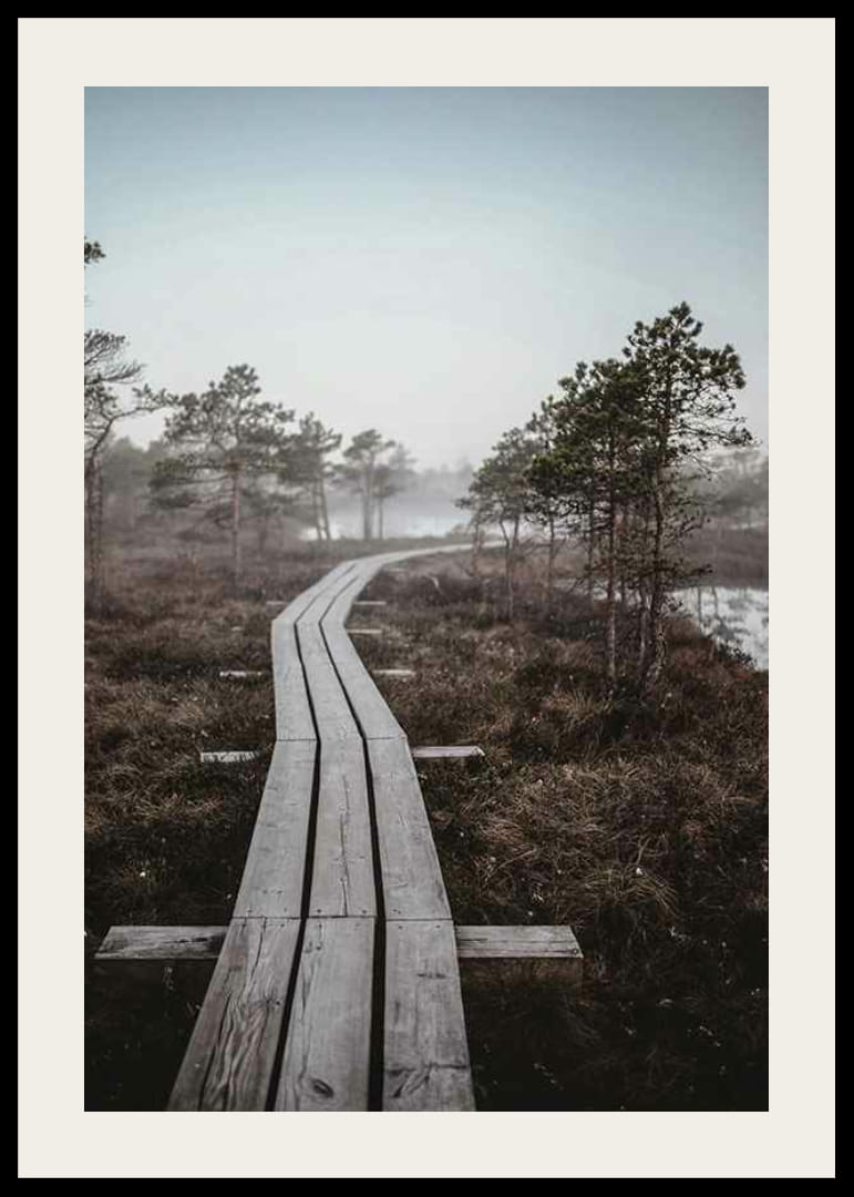 En lang, smal trebrokasje fører inn i et tåkete sumplandskap omgitt av lave furutrær og fuktig vegetasjon. De dempede brune og grå nyansene skaper en nedstrippet følelse med subtile detaljer i morgentåken. Denne plakaten skaper et rolig og naturlig uttrykk som passer for eksempel til en gang, stue eller arbeidsrom.