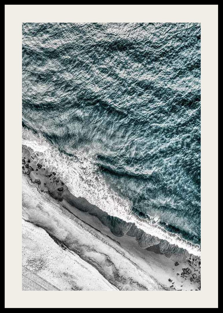 Luftfoto av en steinete strand der hvite bølger slår mot sanden. Kontrasten mellom havets turkise fargetoner og den lyse, nesten monokrome stranden gir et grafisk inntrykk. Denne plakaten kombinerer naturlige former med klare linjer og passer for rom der man ønsker en rolig maritim følelse.