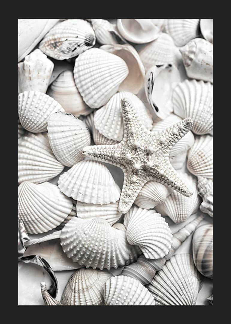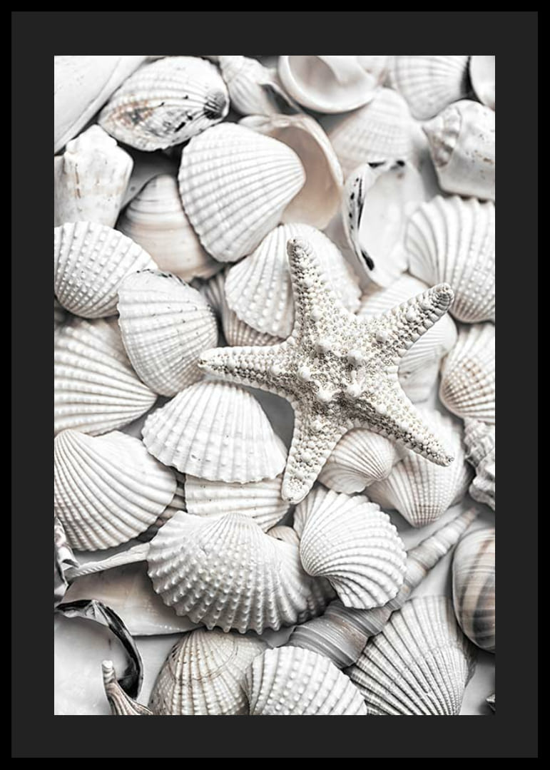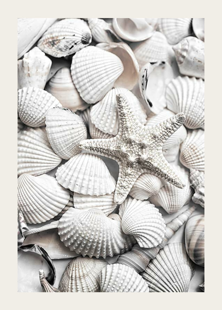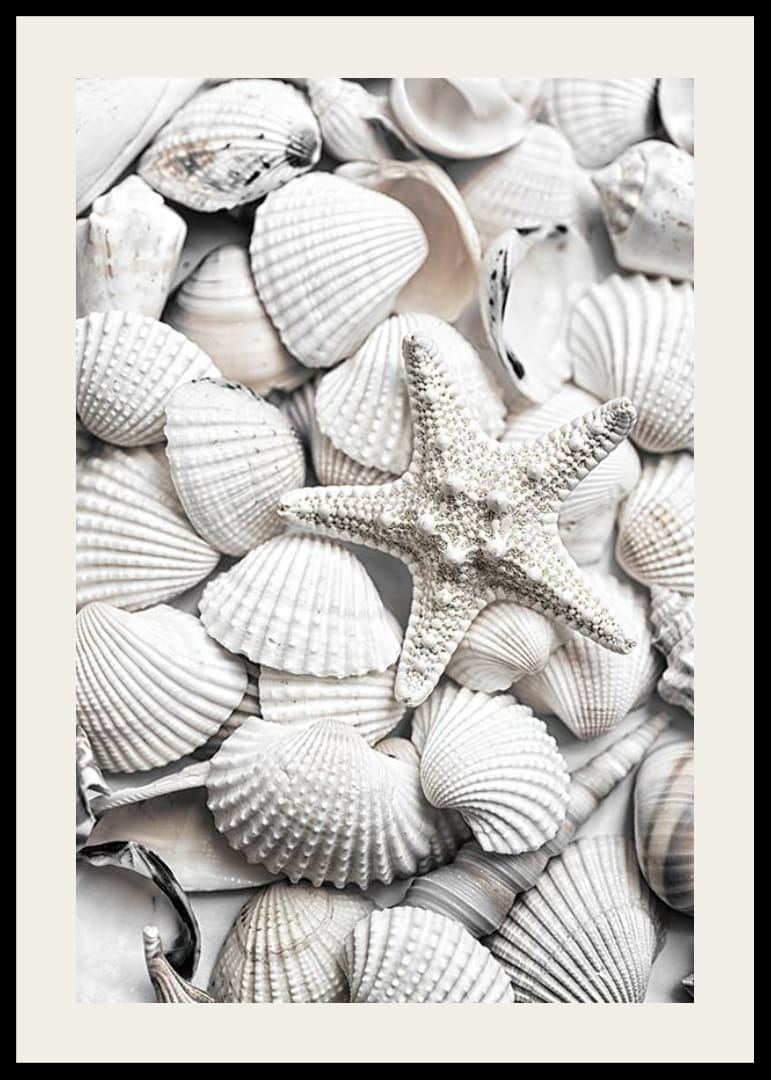 Et nærbilde av en samling hvite skjell, med en sjøstjerne fremtredende plassert i midten av bildet. De ulike formene og teksturene er fanget i mykt lys, noe som skaper en luftig og sommerlig følelse. Denne plakaten gir et naturlig preg til hjemmet ditt og er spesielt egnet for lyse, avslappede miljøer.