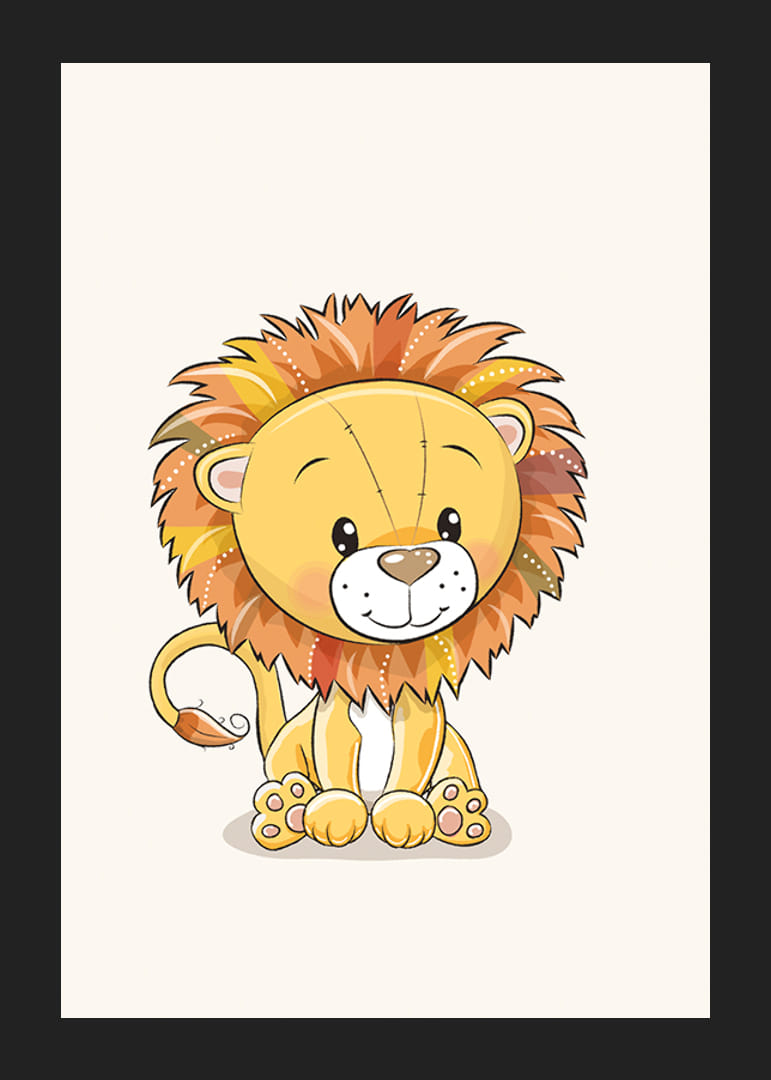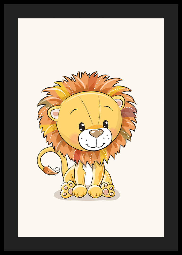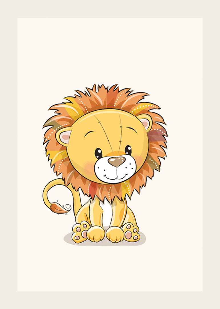 En løveunge med en stor, flerfarget man sitter midt i motivet mot en lys bakgrunn. De brune, oransje og gule nyansene i manen skaper et mykt og lekent uttrykk. Halen har en liten dusk i enden. Denne plakaten i grafisk stil gir en vennlig følelse til barnerom eller lekeområder og passer godt i en motivserie med dyr.