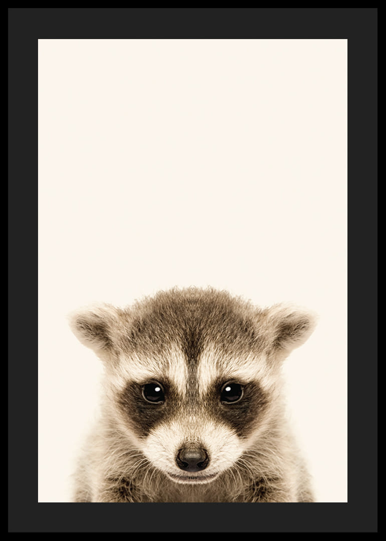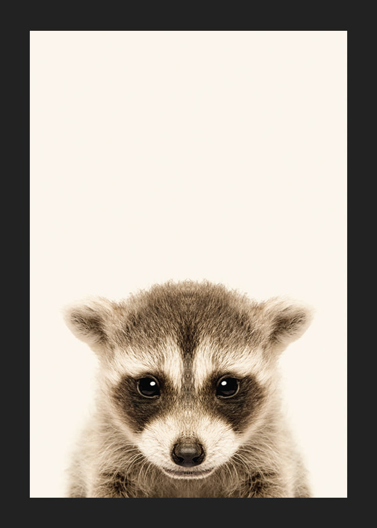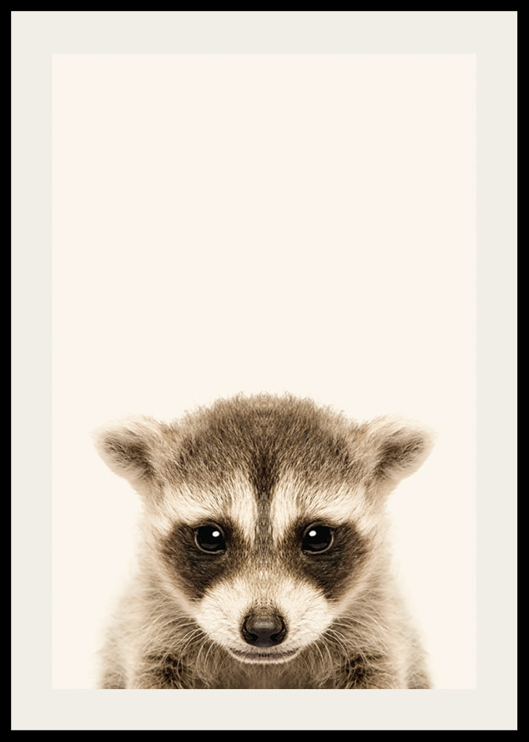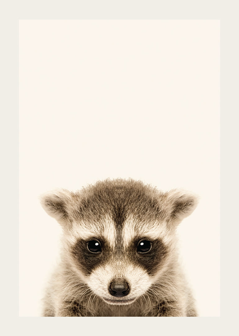 Motivet består av en vaskebjørnunge forfra med tydelige mørke tegninger rundt øyne og nese. Den lysebeige bakgrunnen fremhever de gråbrune detaljene i pelsen og gir et mykt og stilig inntrykk. Med sitt diskrete uttrykk passer denne plakaten fint inn på et barnerom eller på en vegg med dyremotiver i hjemmet.