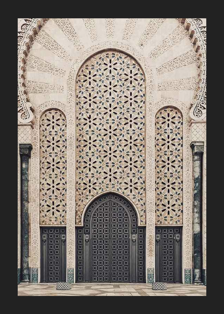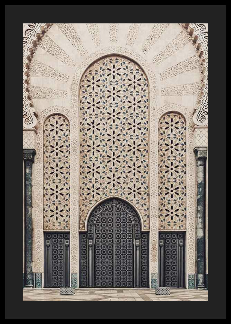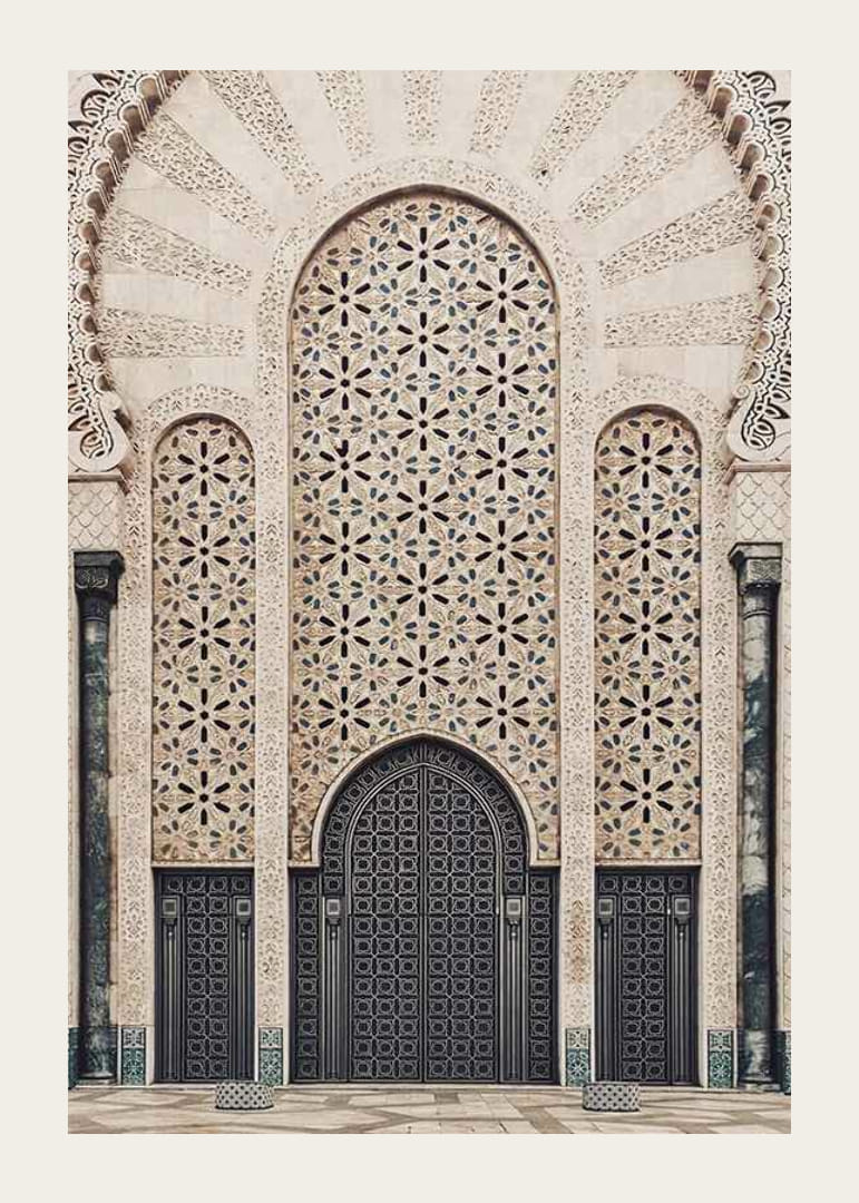En storslått plakat som viser en utsmykket inngangsparti utsmykket med geometriske mønstre og ornamenter i lyse beige- og sandtoner. Buer og hvelv omgir en stor dør med detaljert dekorasjon, omgitt av slanke søyler. Plakaten fremhever arabisk arkitektur og tilfører struktur og karakter til både moderne og tradisjonelle interiører.