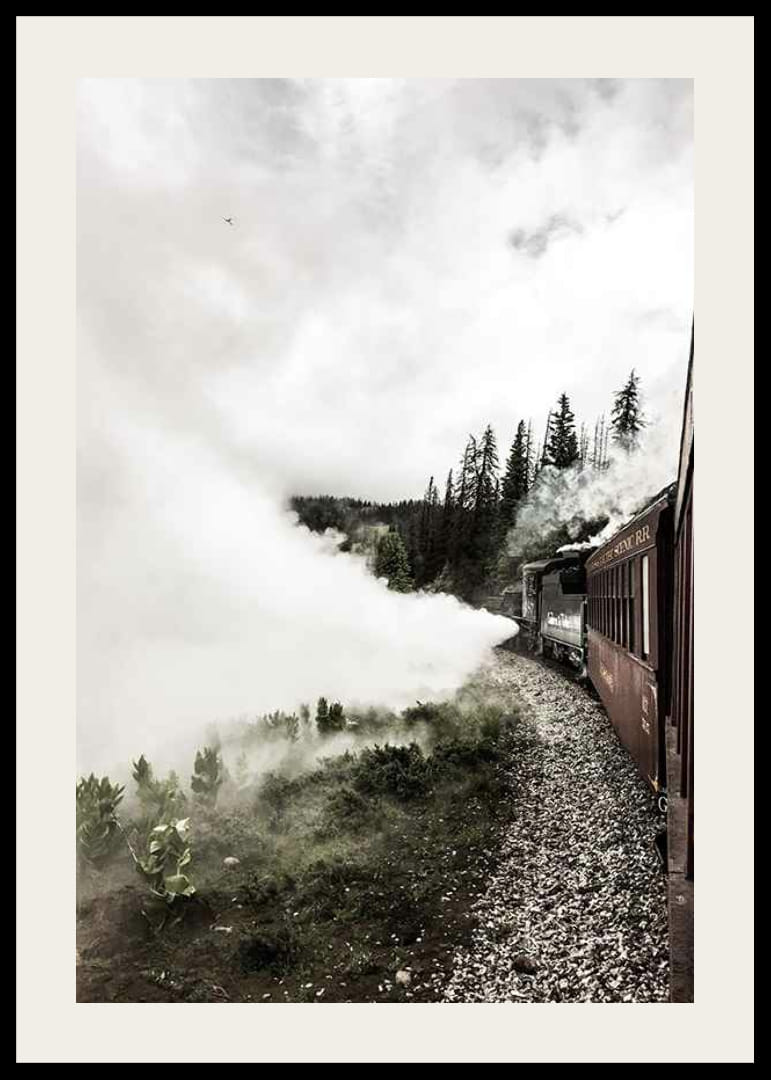 Et klassisk damplokomotiv sees slynge seg langs en svingete jernbane omgitt av tett skog og grøntområder. Tykk hvit røyk velter fra lokomotivet og fyller landskapet, mens togvogner i tre strekker seg tilbake i bildet. Lyse, dempede farger skaper en nostalgisk følelse og gir plakaten et tidløst uttrykk i for eksempel en stue eller et arbeidsrom.