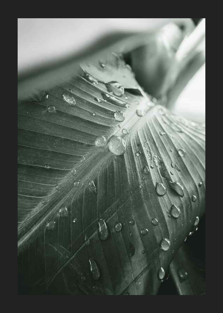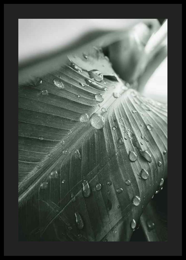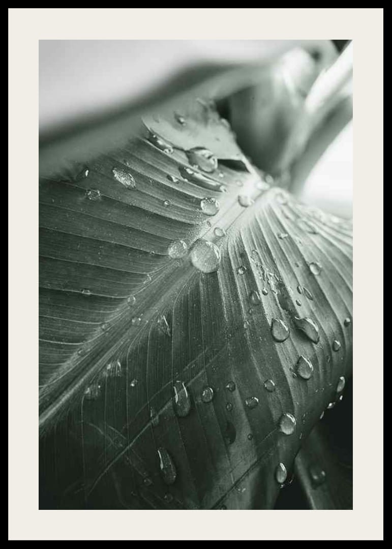 Nærbilde av et palmeblad der glitrende vanndråper hviler på de dypgrønne årene. Monokrome toner og myke kontraster skaper en rolig, naturlig følelse. Den detaljerte strukturen gir et organisk inntrykk som forsterkes av det sparsomme lyset. Motivet gjør plakaten egnet for både stuer og arbeidsrom.