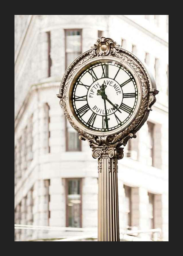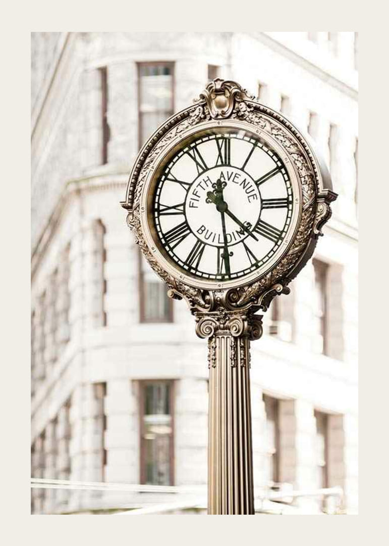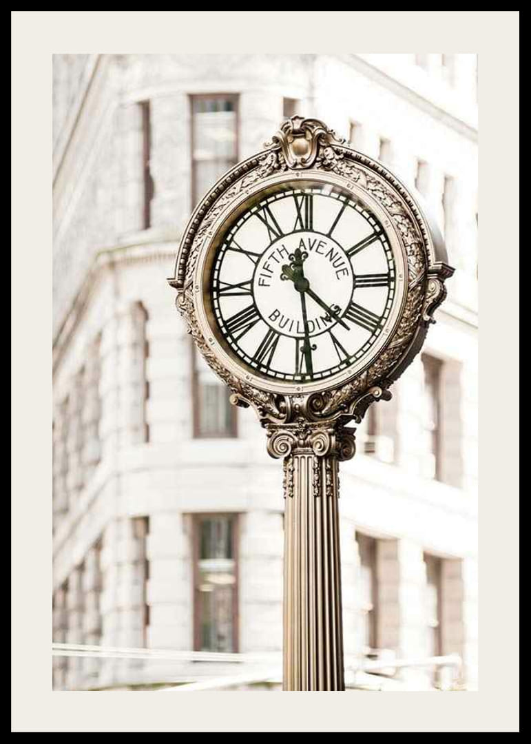 En detaljert visning av den klassiske klokken fra Fifth Avenue Building på 200 Fifth Avenue i New York City, fotografert i gyldne toner mot den lyse fasaden til Flatiron Building. De elegante utsmykningene rundt urskiven skiller seg tydelig ut og skaper en tidløs følelse. Motivet gir en urban følelse, og denne plakaten passer både på kontoret og i stuen.