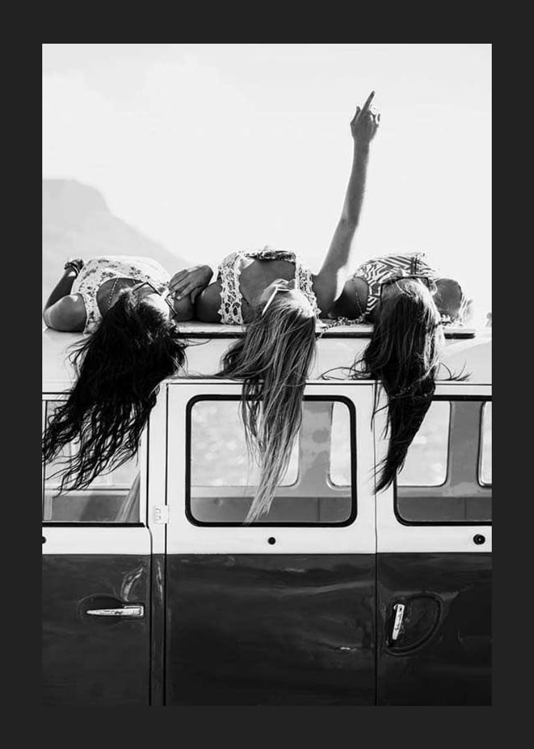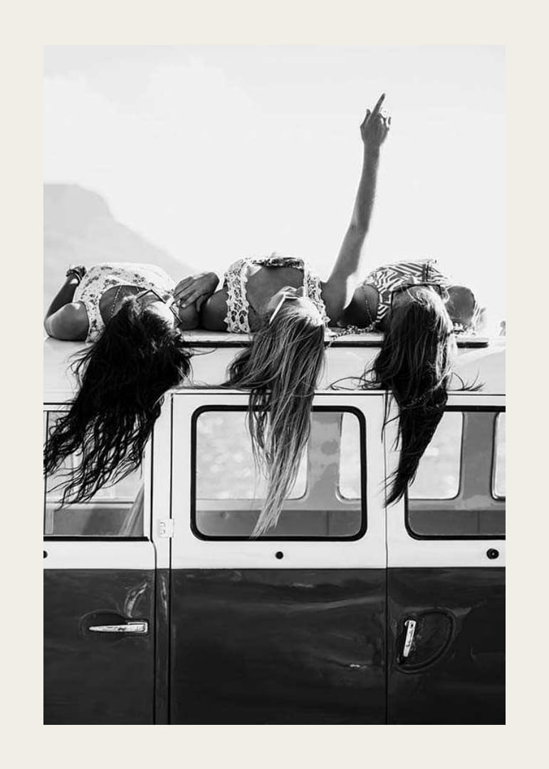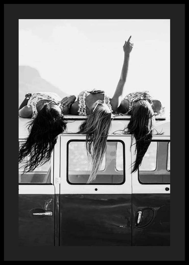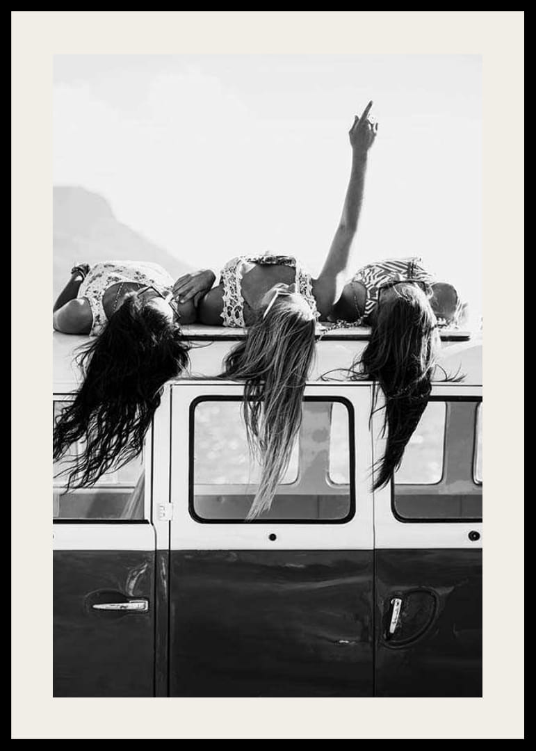 Tre unge kvinner ligger avslappet på taket av en klassisk minibuss med håret hengende nedover siden. En av dem strekker armen mot himmelen, noe som gir en følelse av frihet. Det svart-hvite fargevalget fremhever det tidløse og spontane uttrykket til denne plakaten, som passer for sosiale eller kreative miljøer.