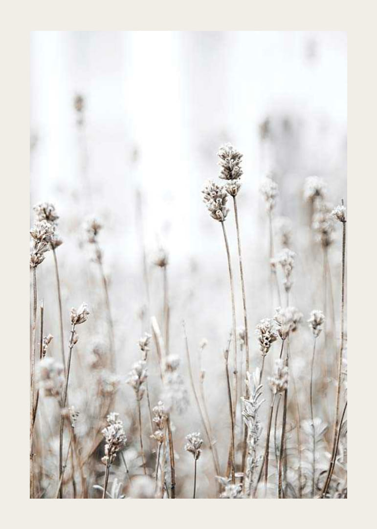 Tørket gress og ville planter med frostede topper reiser seg mot en myk og lys bakgrunn i dempede beige og brune toner. Denne plakaten fanger følelsen av overgangen mellom sommer og høst, og gir et rolig preg av nordisk natur. Passer for soverom, ganger eller stuer der en naturlig aksent verdsettes.