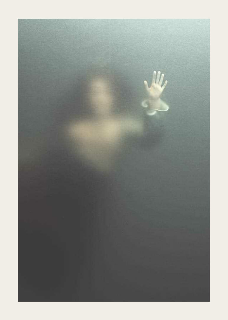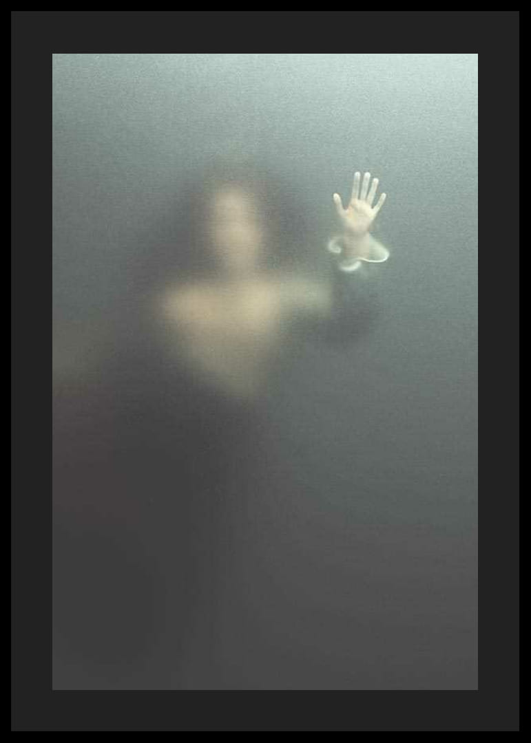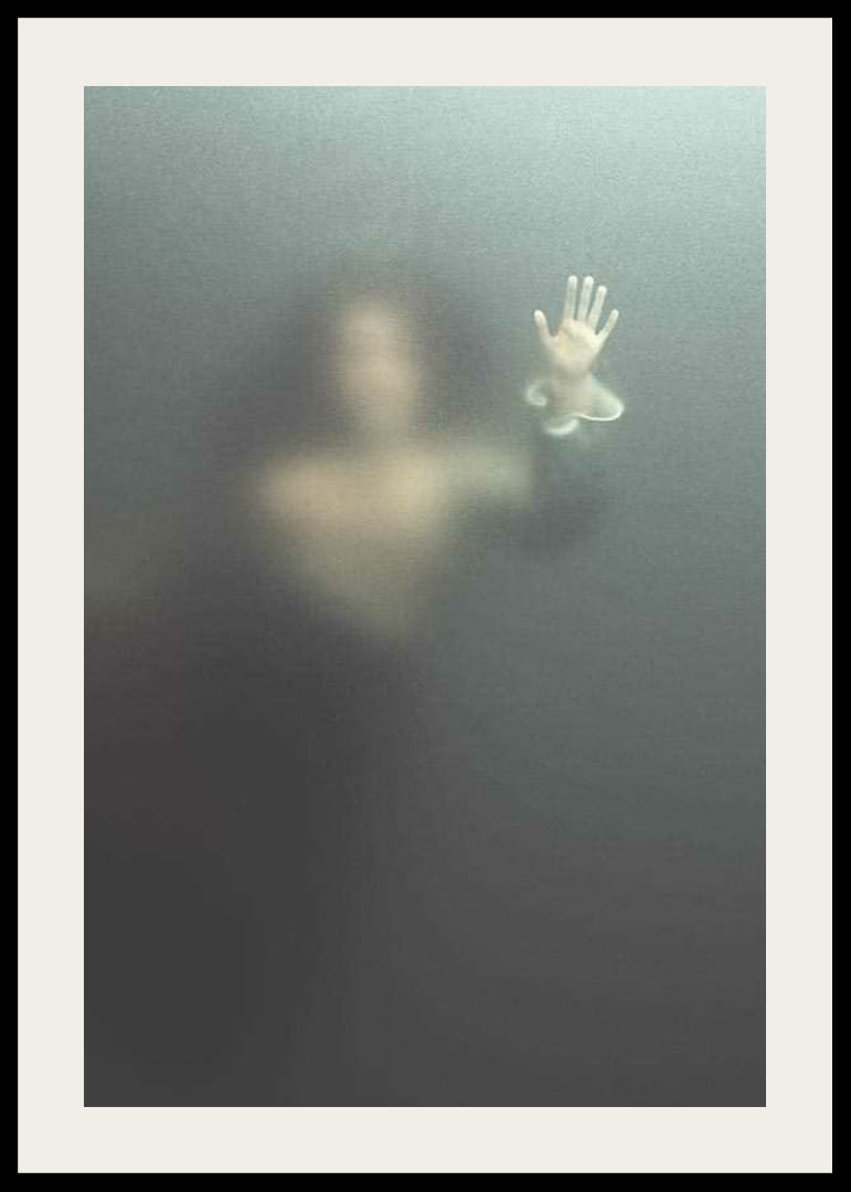 En uskarp kvinnefigur sees gjennom et glass der hånden presses mot overflaten og fremstår skarpere enn resten av kroppen. Myke grå og beige toner dominerer og gir motivet et uttrykksfullt, konseptuelt preg. Denne plakaten vil være et interessant samtaleemne i både moderne og minimalistiske interiørmiljøer.