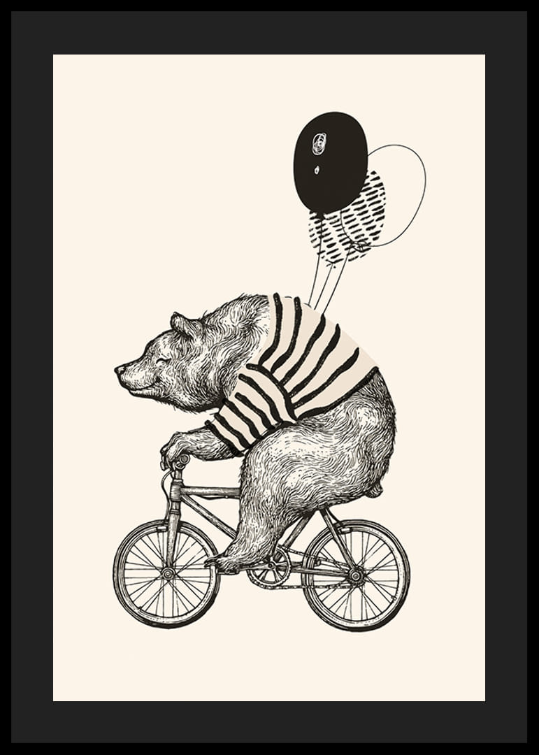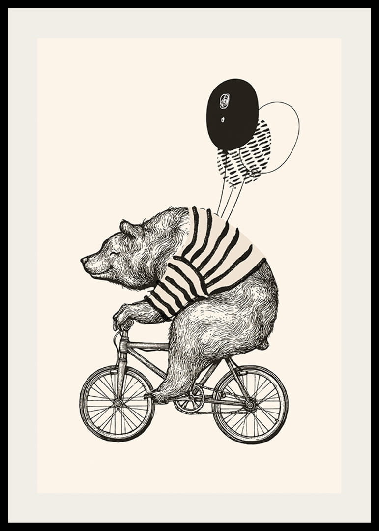 Blyanttegning av en bjørn i stripete genser som sykler i profil, med to svarte ballonger som svever over ryggen. Myke kontraster mot en lys beige bakgrunn skaper et lekent og stilig uttrykk. Denne plakaten er et uttrykksfullt valg for barnerom og passer også inn i lekne familierom.