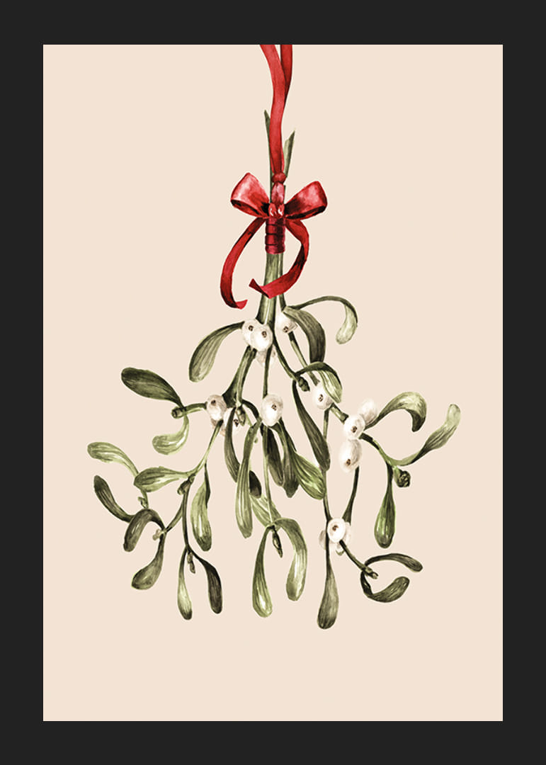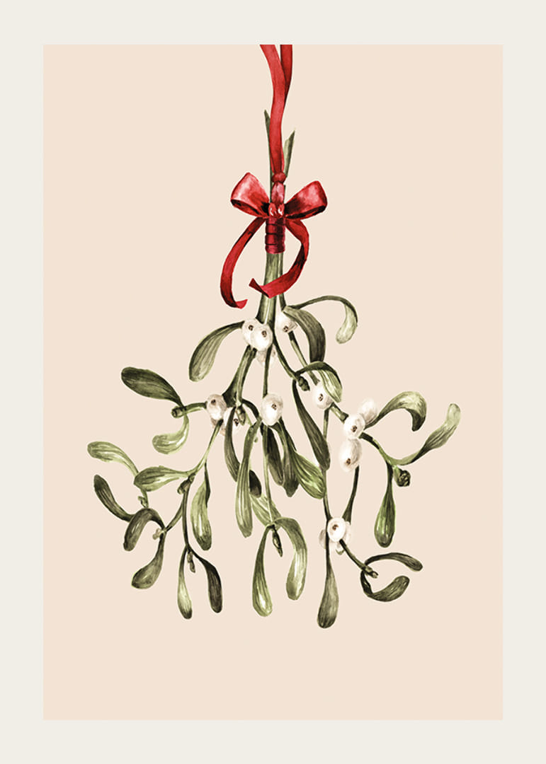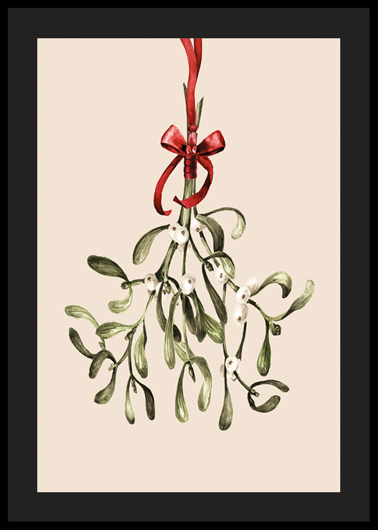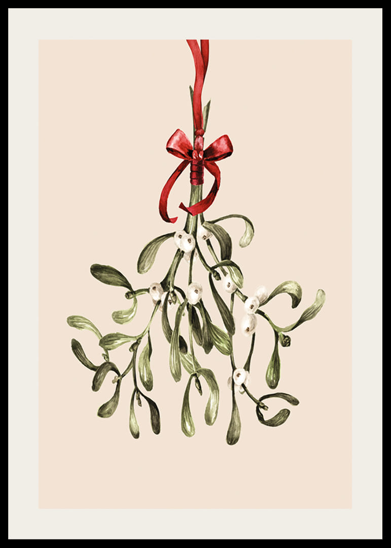 Motivet består av en håndmalt mistelteinkvist med grønne blader og hvite bær, hengende fra et rødt silkebånd og sløyfe mot en sandfarget bakgrunn. De myke, naturlige fargene og den enkle formen gir en rolig, vinterlig følelse. Denne plakaten gir et sesongpreg til stuen, gangen eller kjøkkenet i julen.